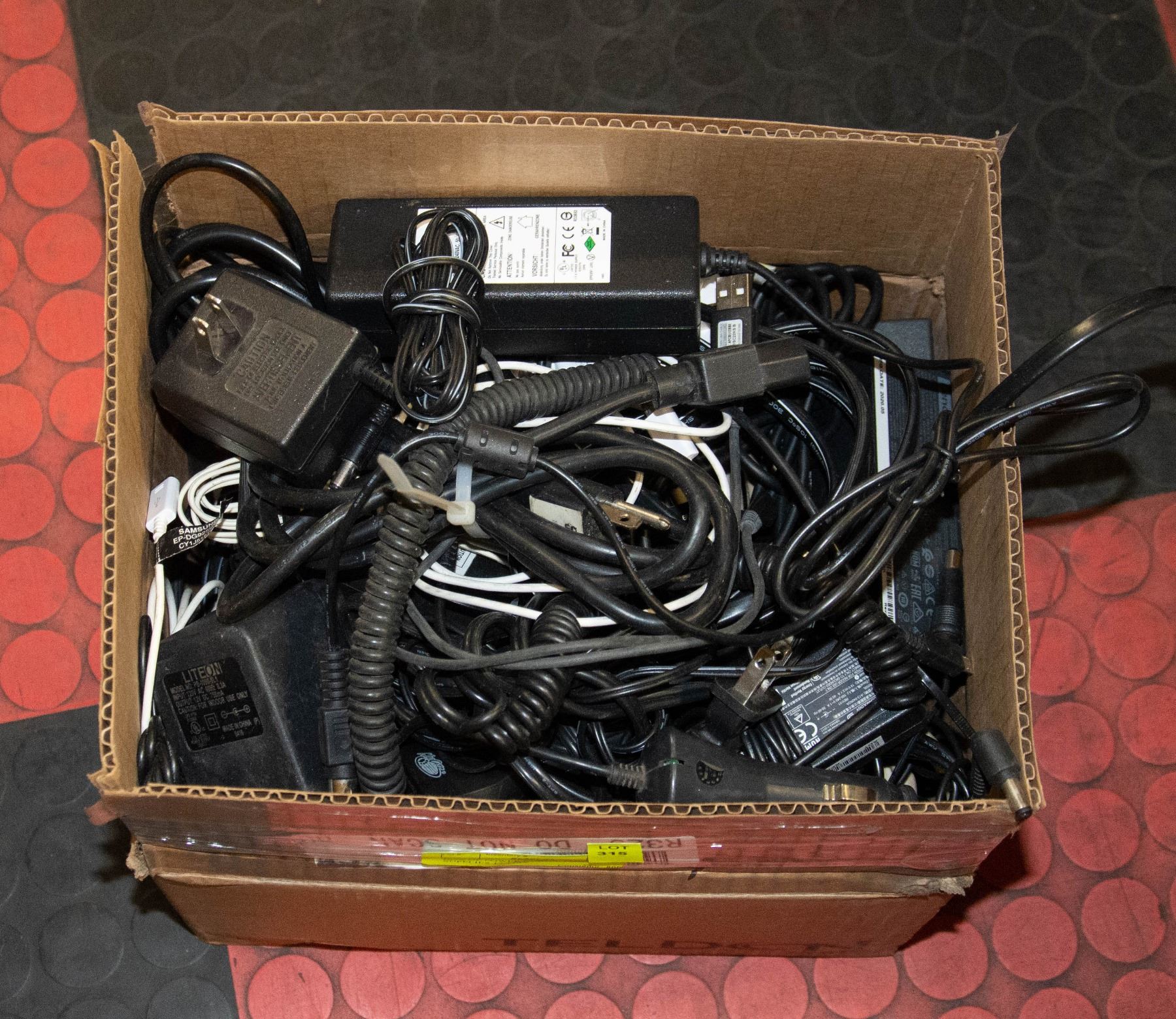 BOX OF POWER CORDS, POWER SUPPLIES 12/110V