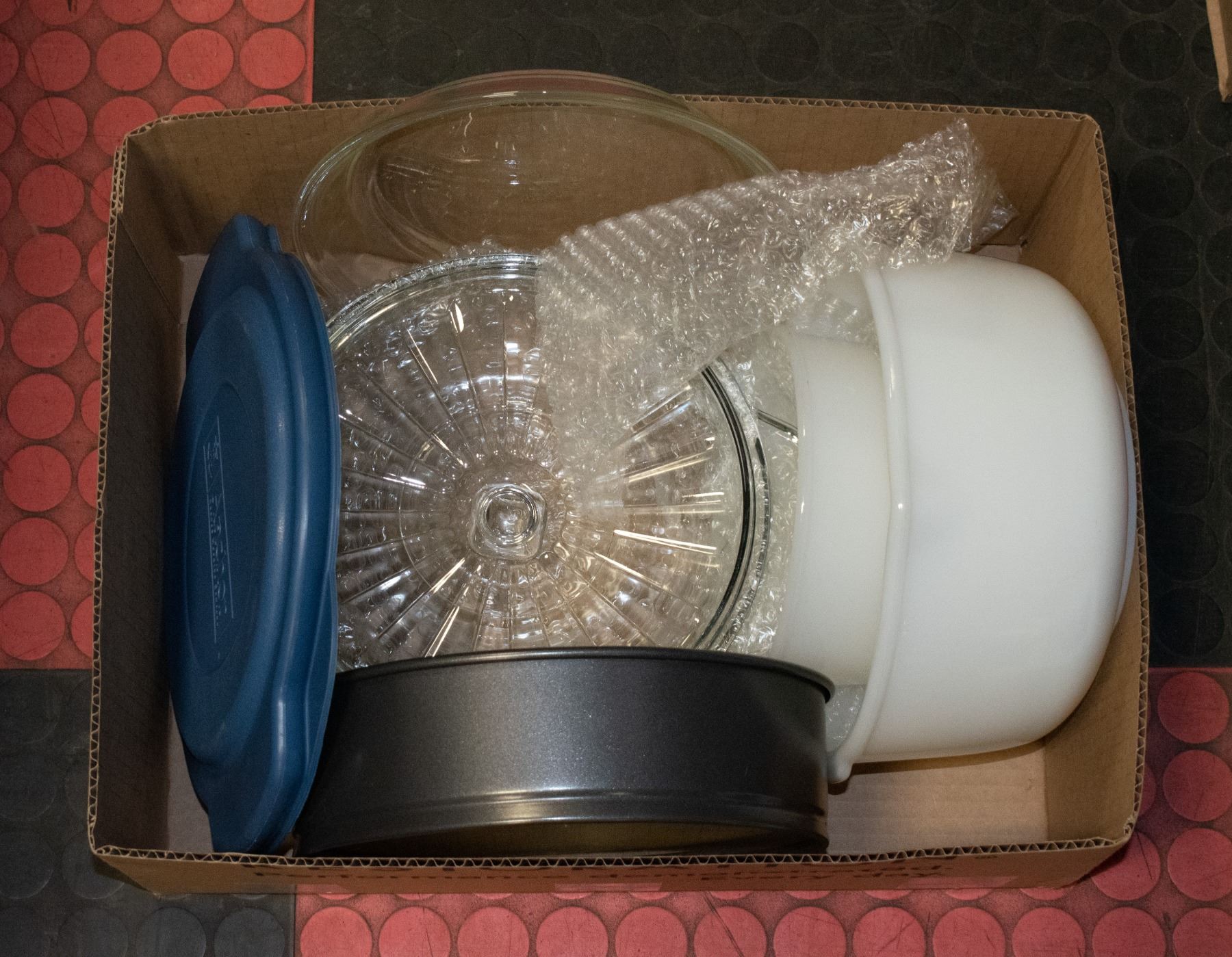 GLASSBAKE WHITE MIXING BOWLS, FIRE KING CLEAR GLASS PIE PLATE, NEW GLASS BOTTOM AND NON-STICK BUNDT PAN, CLEAR GLASS 9"-ROUND CASSEROLE WITH GLASS LID AND RUBBER STORAGE TOP **ALL ITEMS MUST BE REMOVED BY 5PM SATURDAY, JANUARY 28TH 2023. **ALL REMAINING ITEMS WILL BE SUBJECT TO A $6.00 PER DAY STORAGE CHARGE. ANY ITEMS REMAINING AFTER MONDAY, FEBRUARY 13TH, 2023 WILL BE CONSIDERED FORFEITED. NO REFUNDS WILL BE ISSUED FOR FORFEITED ITEMS. TO SCHEDULE A PICK UP APPOINTMENT CLICK HERE