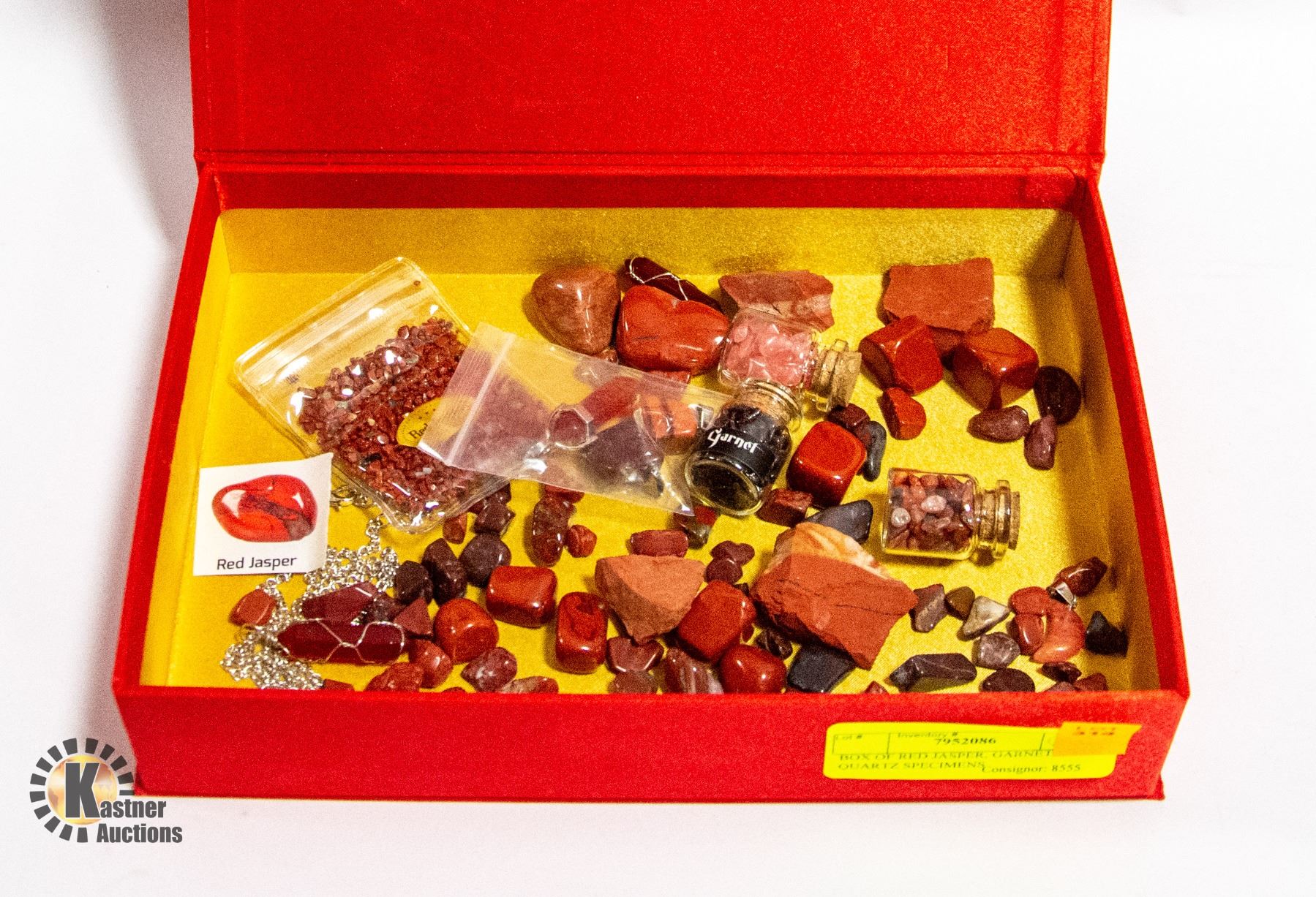 BOX OF RED JASPER, GARNET & RED QUARTZ SPECIMENS