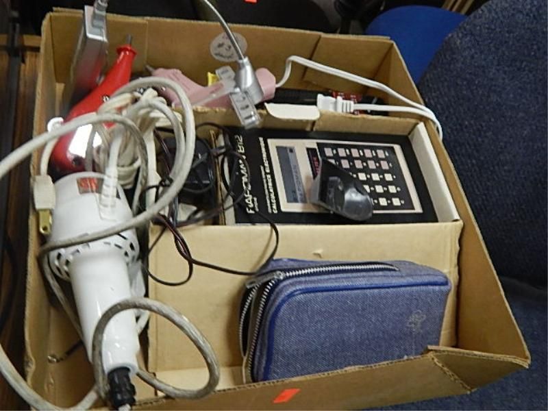 BOX OF RETRO CALCULATORS, RADIO & OTHER STUFF