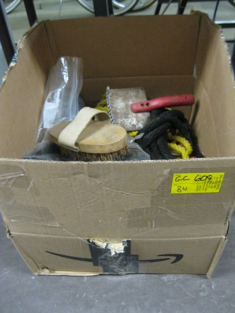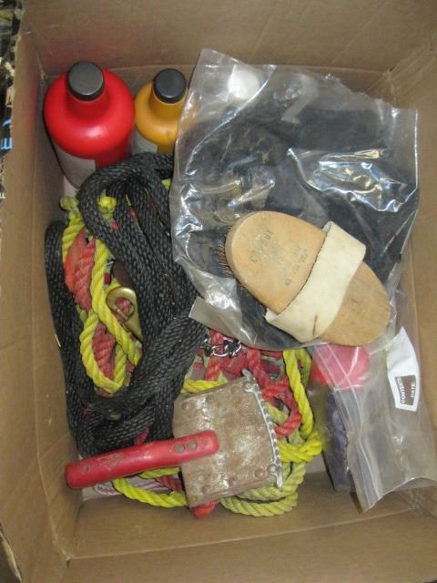 BOX OF ROPE & ASSORTED HORSE CARE PRODUCTS
