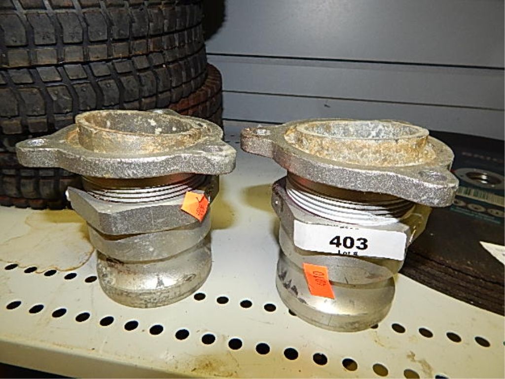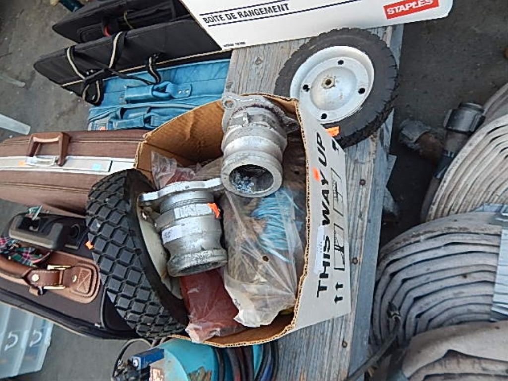 BOX OF ROPE & TRASH PUMP HOSE FITTINGS - 2 & DOLLY WHEELS