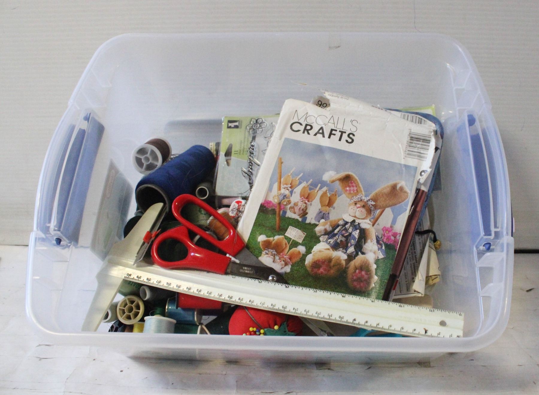 BOX OF SEWING ACCESSORIES: PATTERNS, SCISSORS