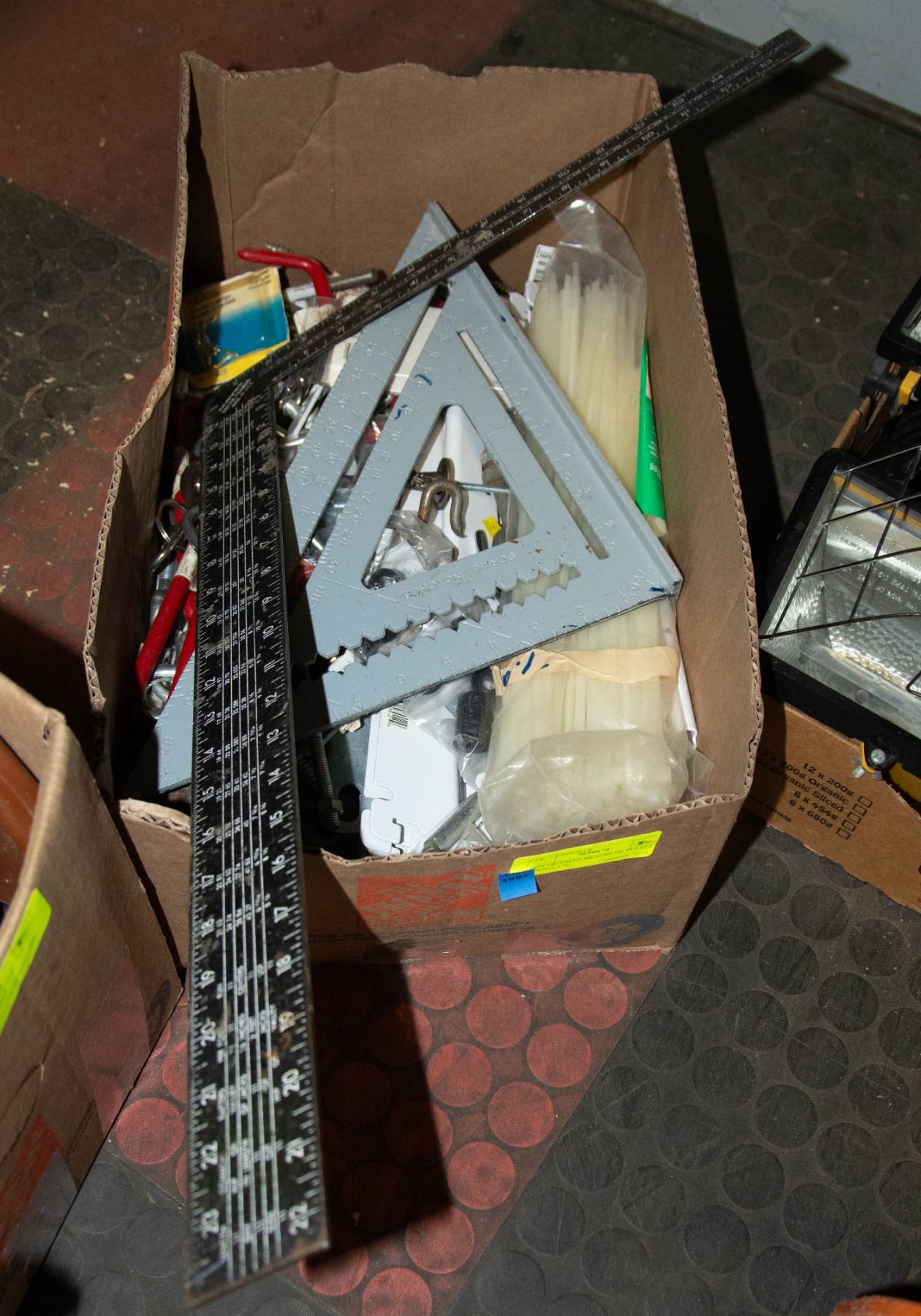BOX OF SHELF BRACKETS, PULLEY, HOOKS, ETC.