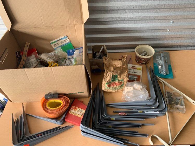 BOX OF SHELVING BRACKETS, BOLTS AND BRACKETS