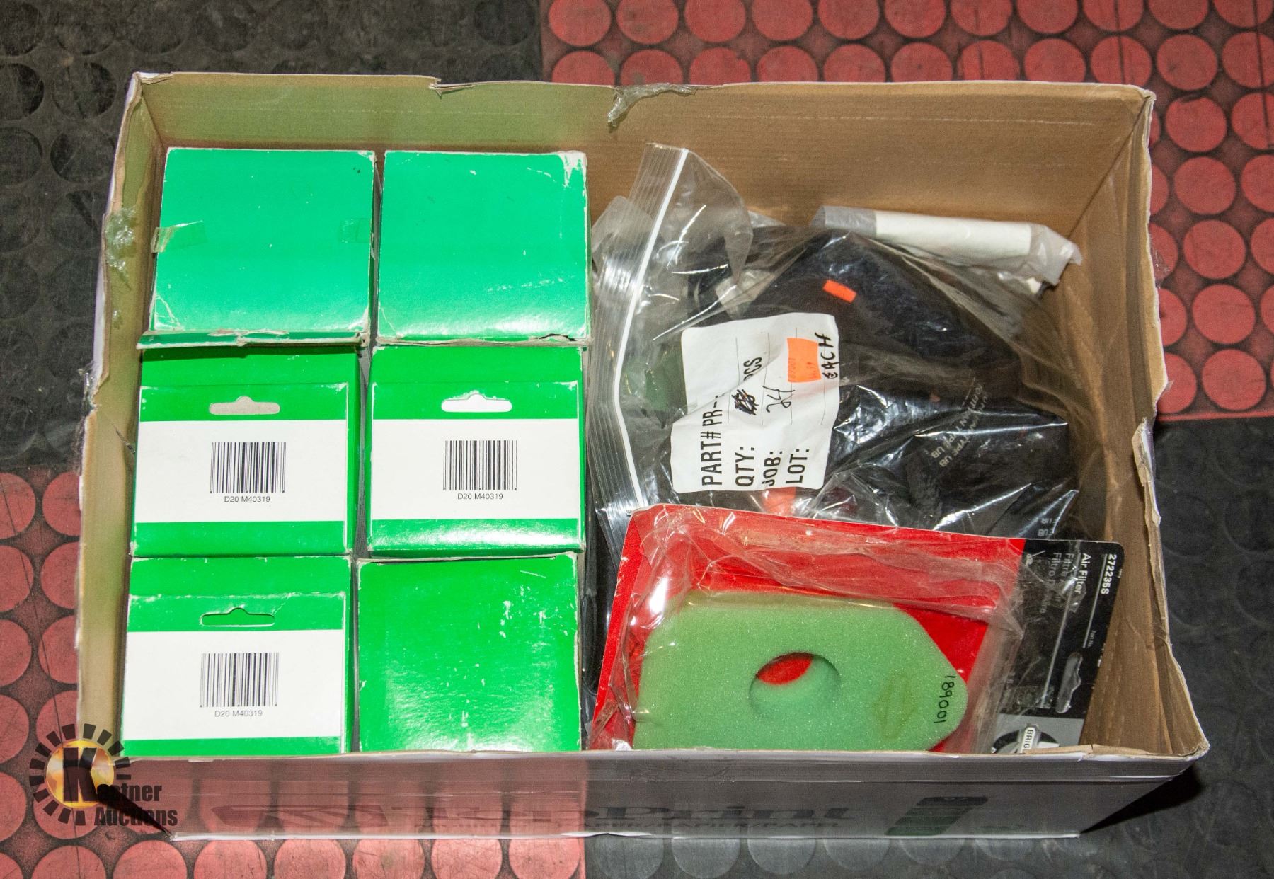 BOX OF SHOP SUPPLIES INCLUDES FILTERS, BELTS &