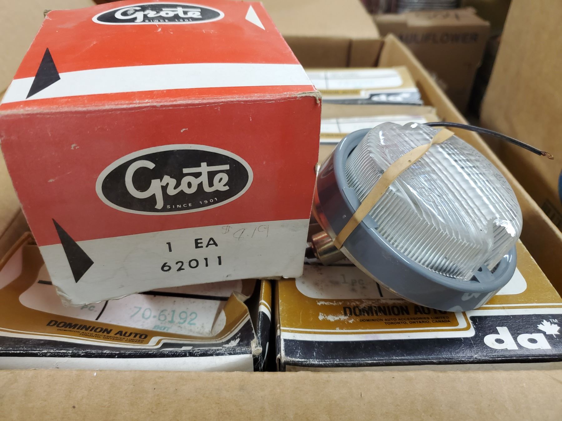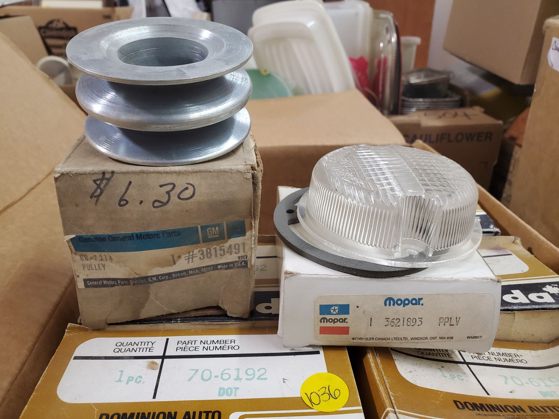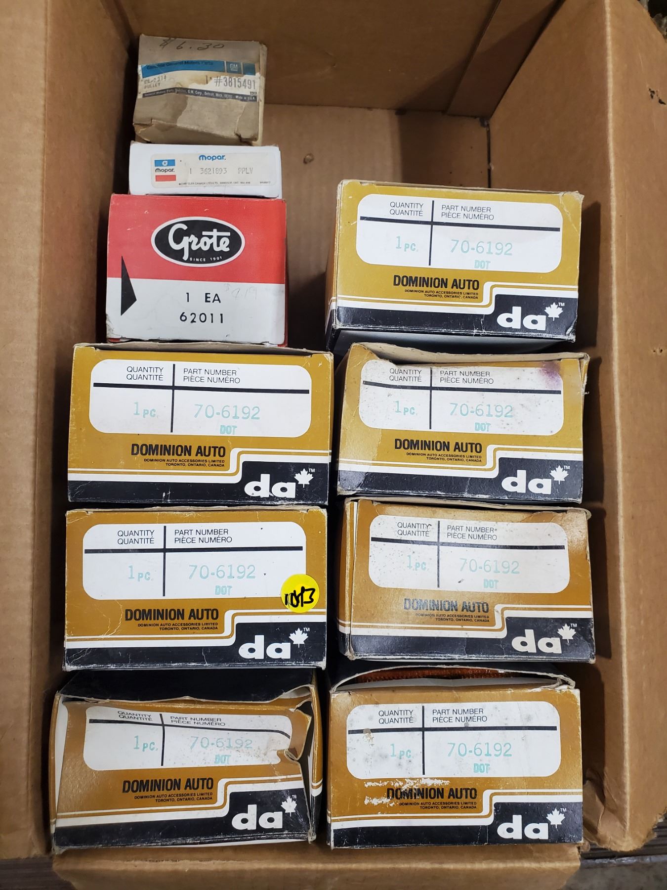BOX OF SPARE VEHICLE PARTS (GM, DOMINION, MOPAR, ETC)