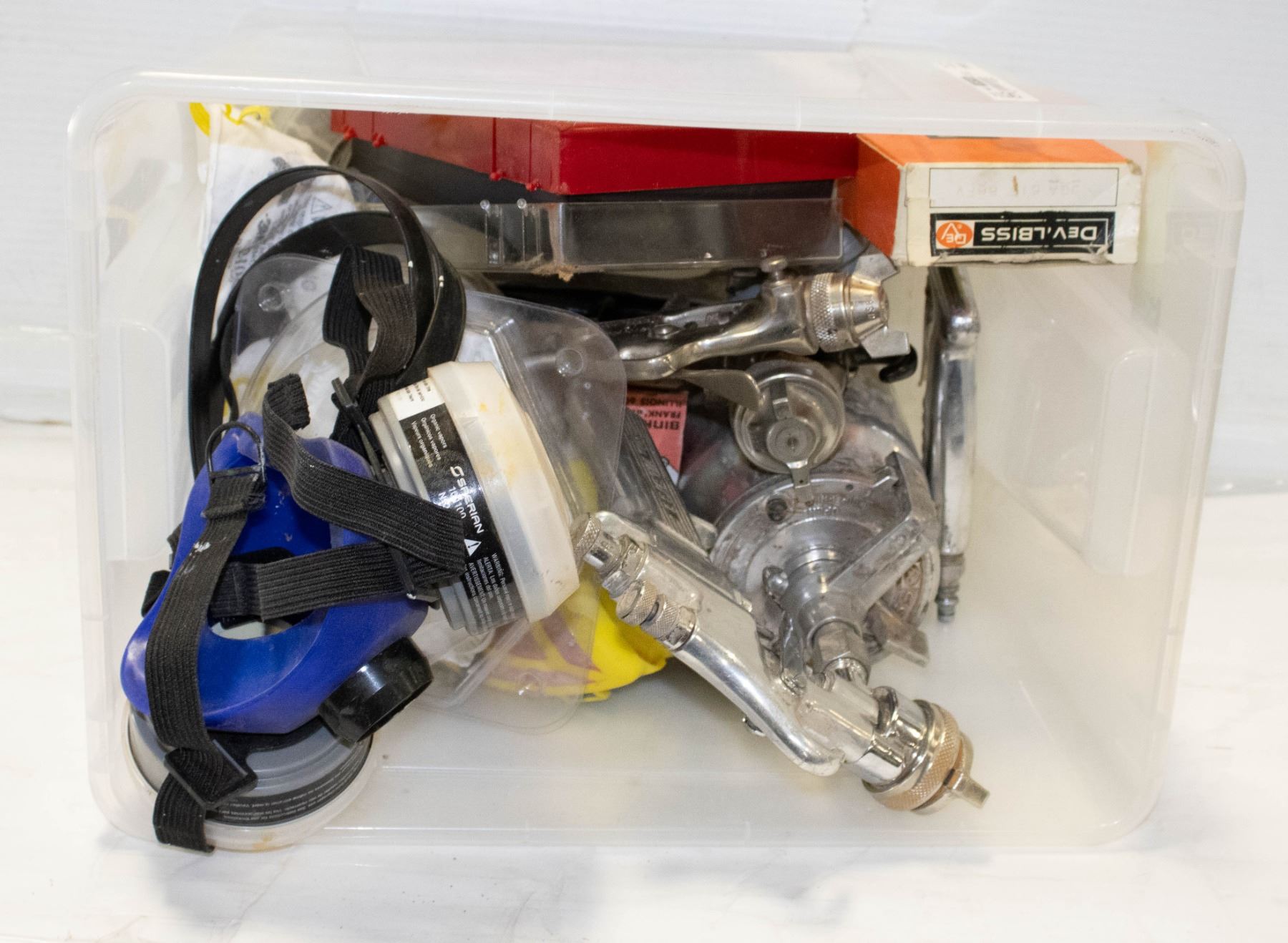 BOX OF SPRAY GUNS, MASKS, FILTERS, ETC
