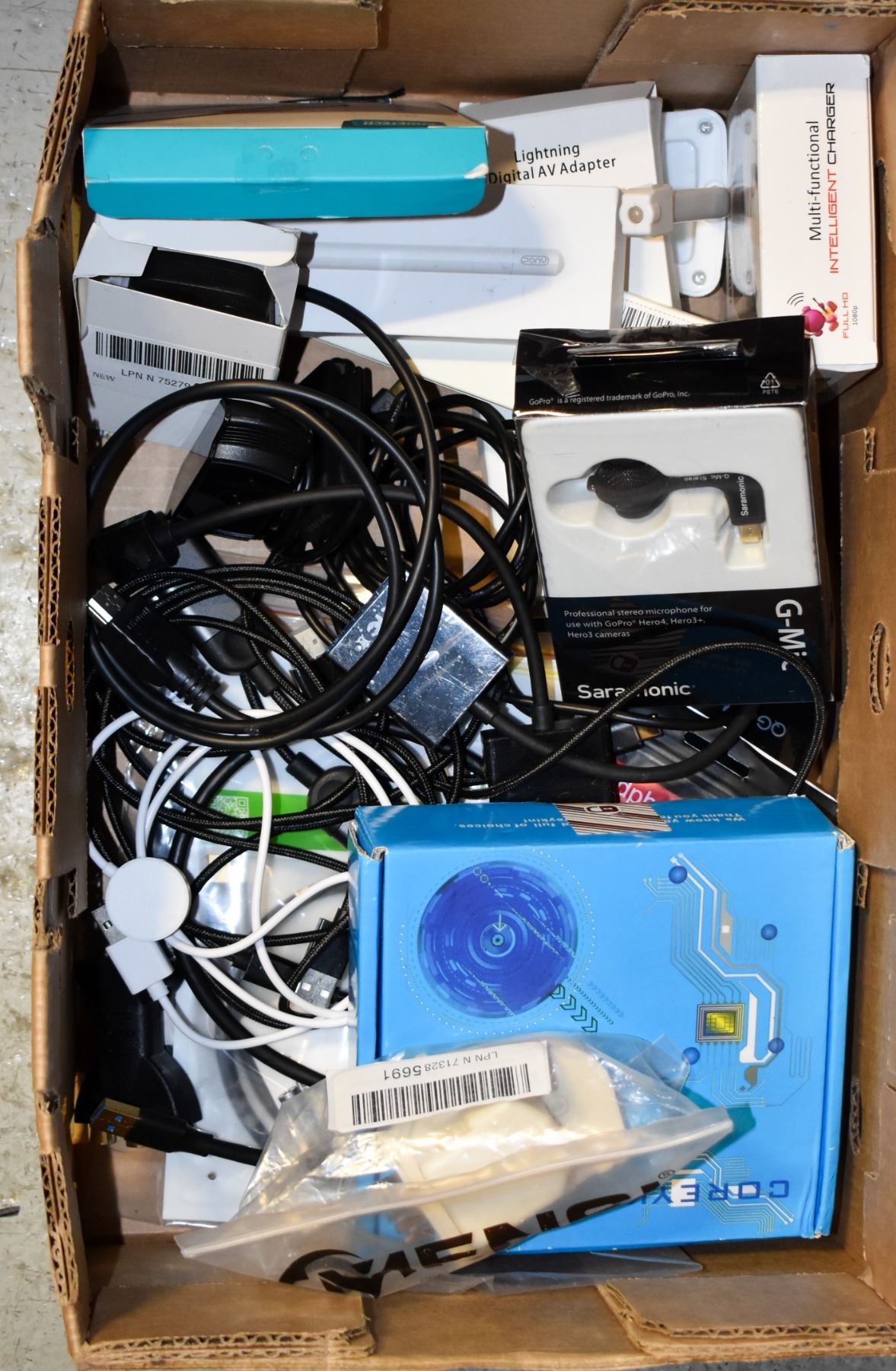 BOX OF TECH, INCLUDING CHARGERS, ADAPTERS