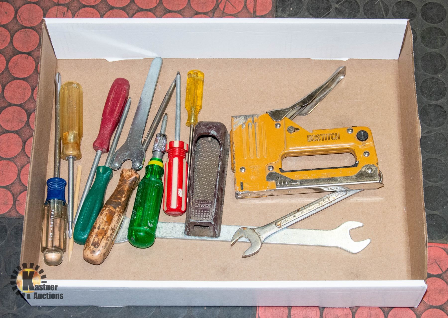 BOX OF TOOLS BOSTICH STAPLE GUN,SCREW DRIVERS,