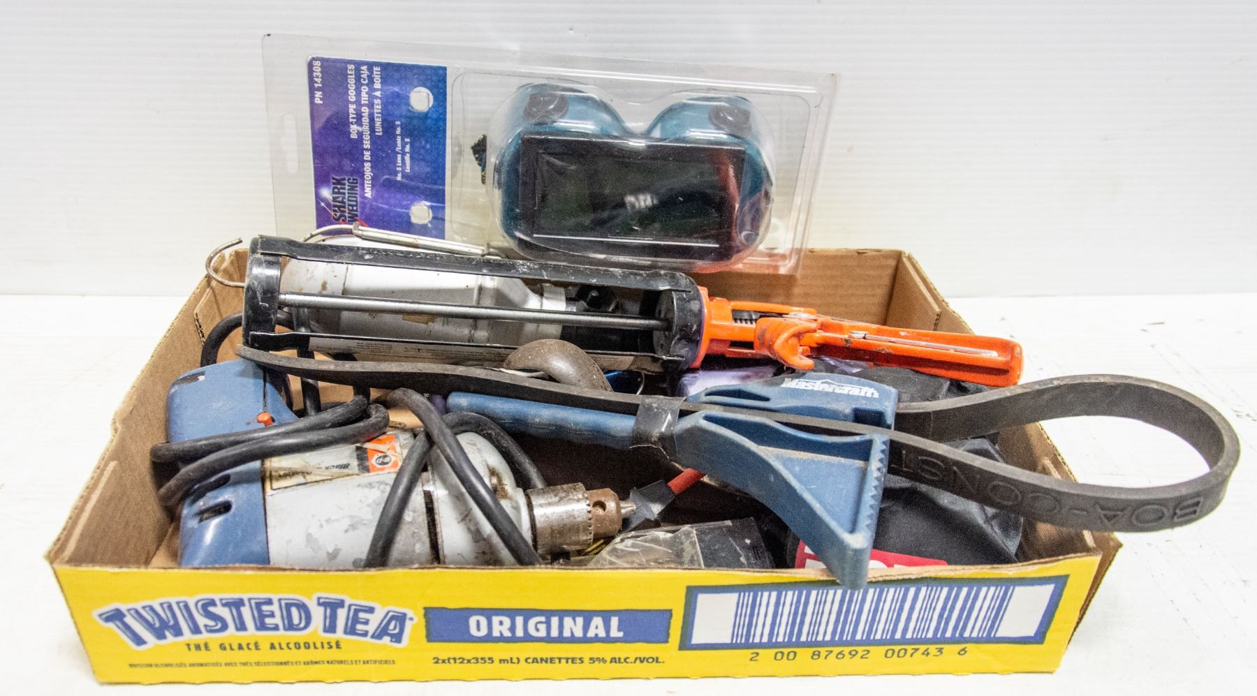 BOX OF TOOLS: DRILL, WELDING GOGGLES, TROUBLE
