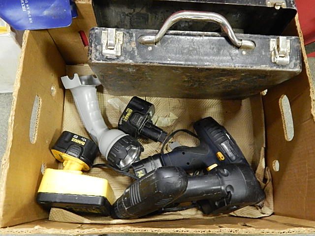BOX OF TOOLS - DRILLS & DEWALT BATTERYS & CHARGER ETC