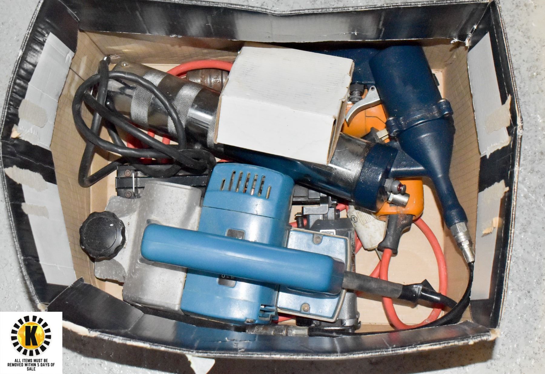 BOX OF TOOLS WITH AIR GREASE GUN, DRILL, NAILER