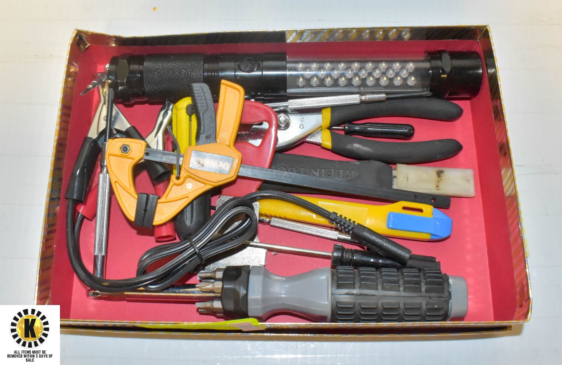 BOX OF TOOLS INCLUDING DEWALT, KLEIN AND MISC.