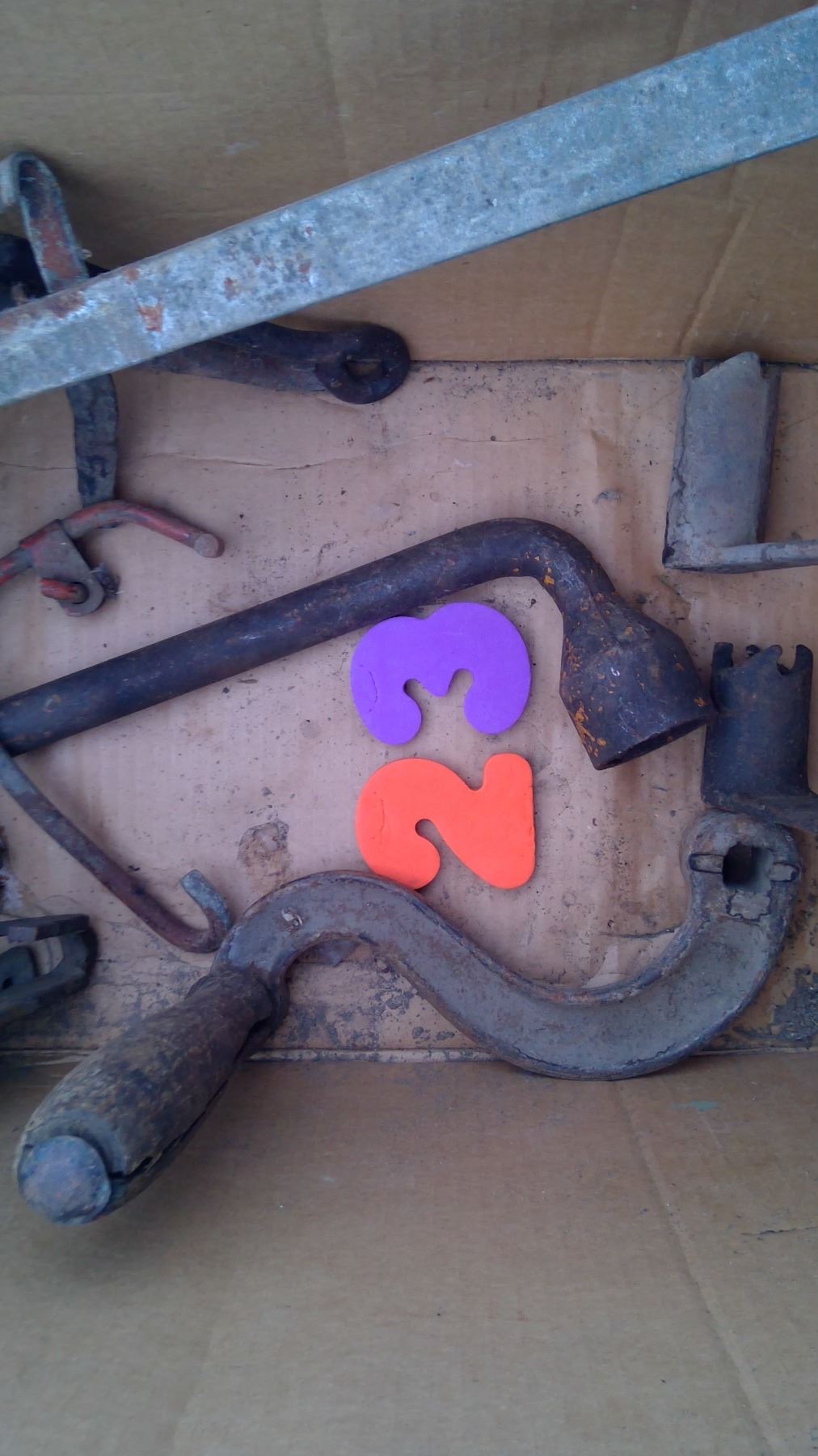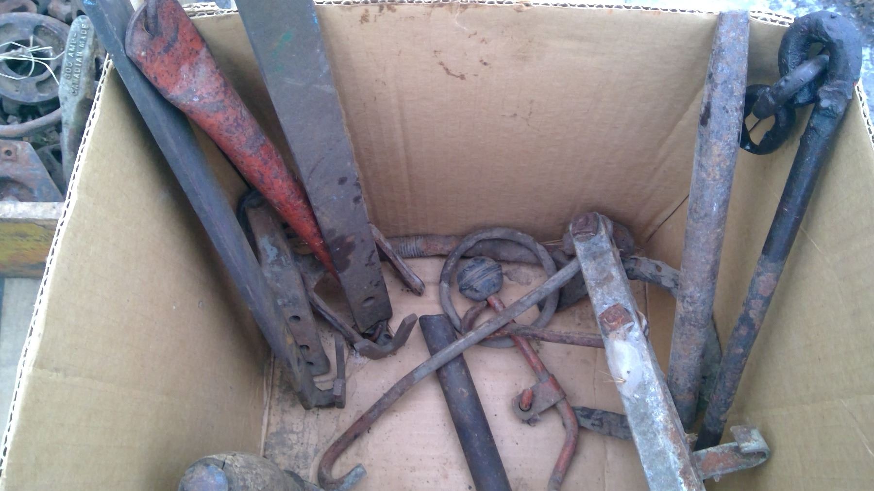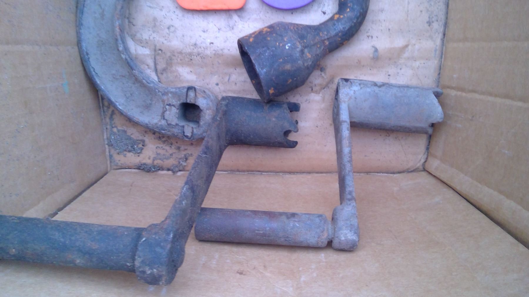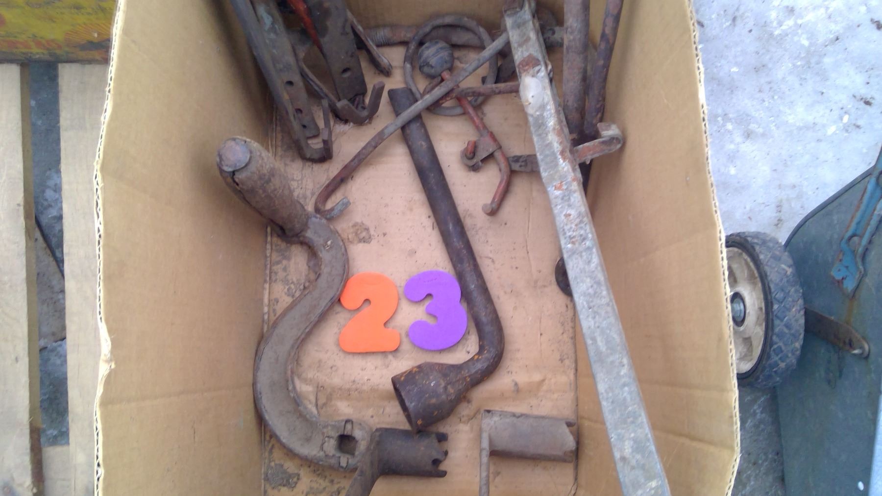 BOX OF TRACTOR CRANKS & OLD TOOLS & WRENCHES