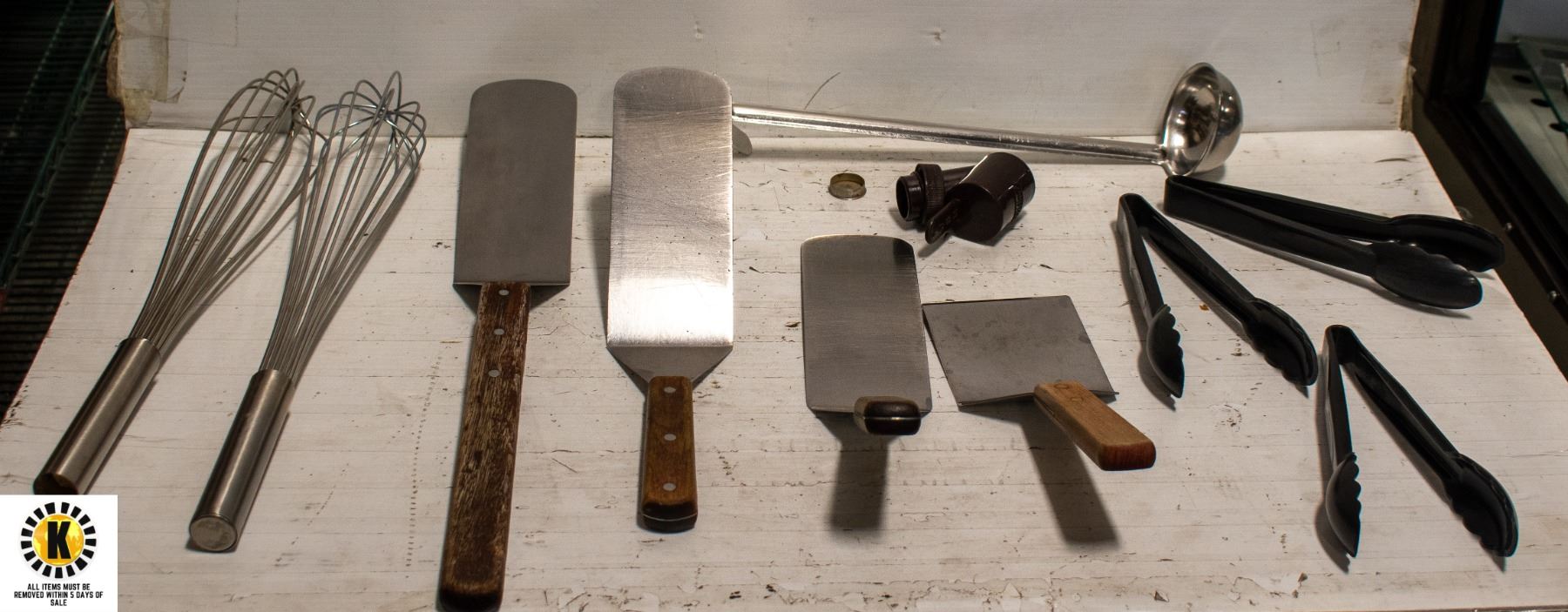 WHIPS 18", 3 STAINLESS SPATULAS, 3 PLASTIC TONGS, 1 4OZ STAINLESS STEEL LADDLE, 1 CONDIMENT HEINZ DISPENSING VALVE