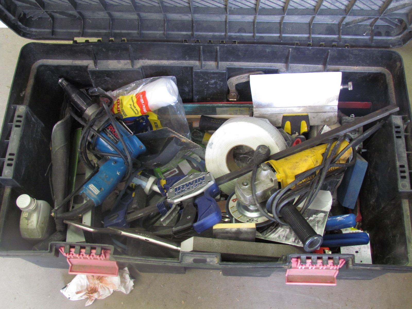 BOX OF VARIOS TOOLS, DRILL, SIDE GRINDER, QUIP GRIP, VICE CLAMPS, MISC