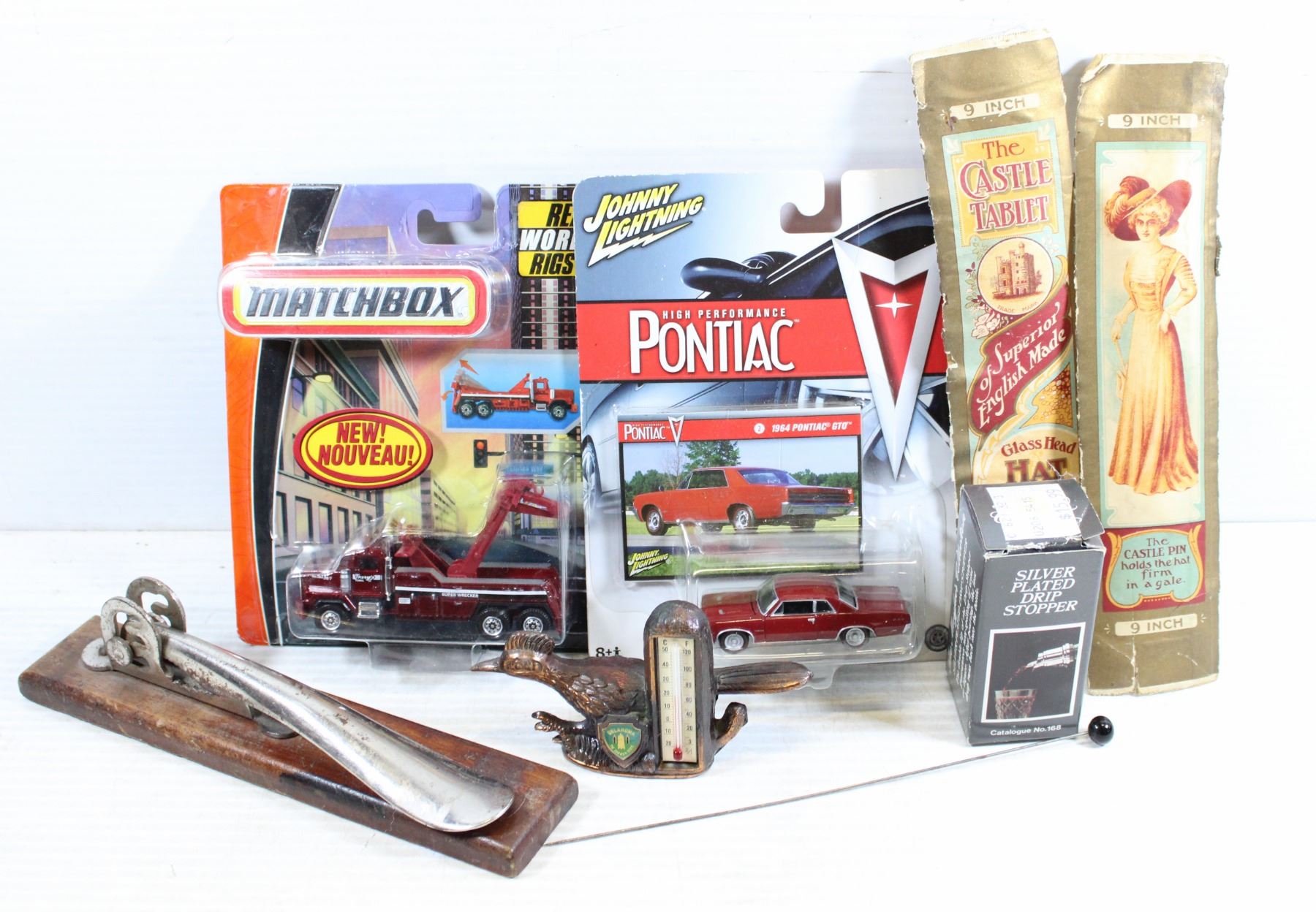 MATCHBOX CARS IN ORIGINAL UNOPENED PACKAGING, 9 INCH HAT PIN, VINTAGE NUTCRACKER, SILVER PLATED DRIP STOPPER, AND VINTAGE BIRD THERMOMETER