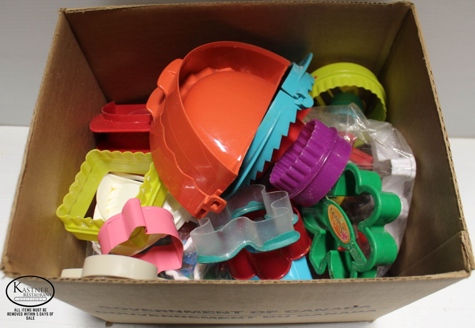 BOX OF VARIOUS COOKIE CUTTERS, PEROGIE FOLDERS
