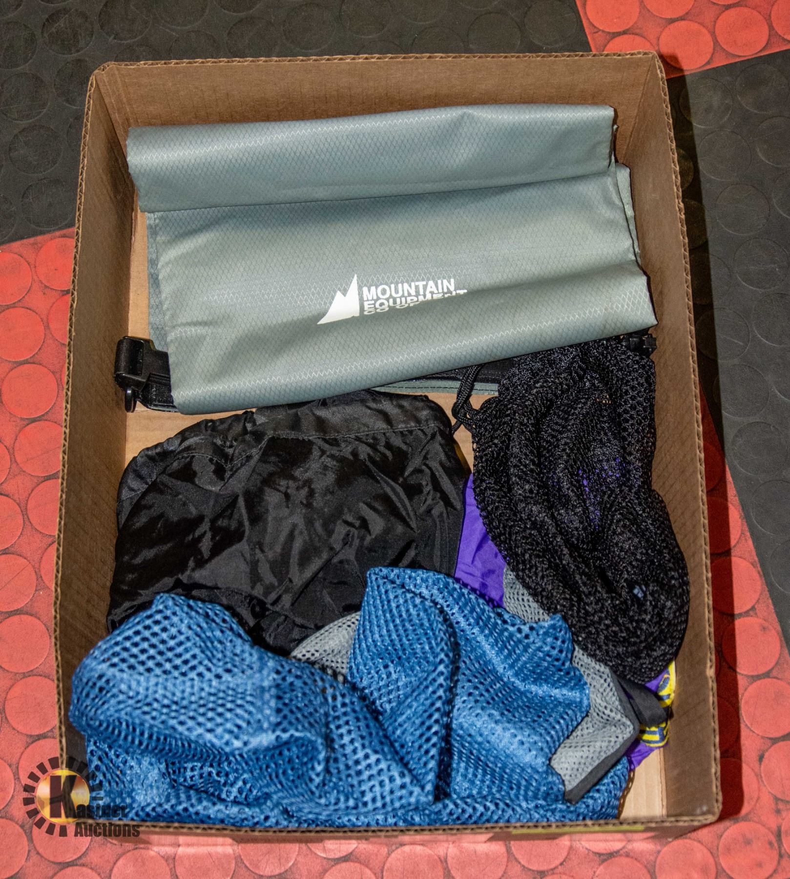 AND ACCESSORIES INCL. EXTRA LONG MOUNTAIN CO-OP WATER PROOF BARREL BAG, SEVERAL NYLON BAGS AND SEVERAL SIZES OF NYLON MESH BAGS, ETC. **ALL ITEMS MUST BE REMOVED BY 5PM SATURDAY, MAY 20TH 2023. ALL REMAINING ITEMS WILL BE SUBJECT TO A $6.00 PER DAY STORAGE CHARGE. ANY ITEMS REMAINING AFTER MONDAY, JUNE 5TH, 2023 WILL BE CONSIDERED FORFEITED. NO REFUNDS WILL BE ISSUED FOR FORFEITED ITEMS. TO SCHEDULE A PICK UP APPOINTMENT CLICK HERE