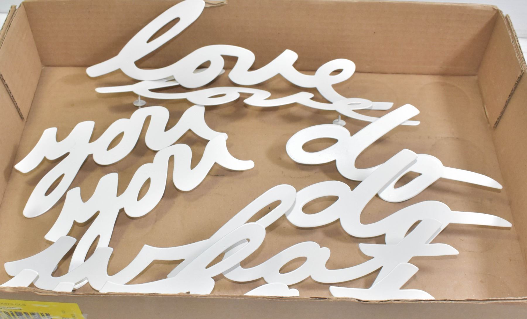 2 OF EACH WHITE IN COLOR (DO, WHAT, YOU , AND LOVE) HAS SCREWS ON THE BACK SO THEY CAN BE ATTACHED TO ANYTHING