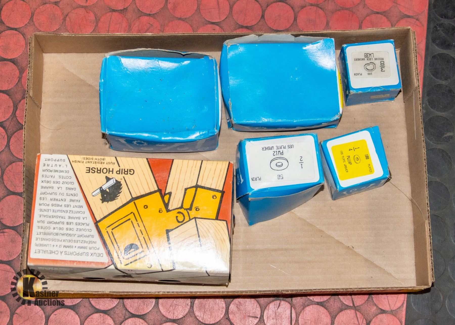 BOX OF VARIOUS SIZE WASHERS AND A SAWHORSE BRACKET