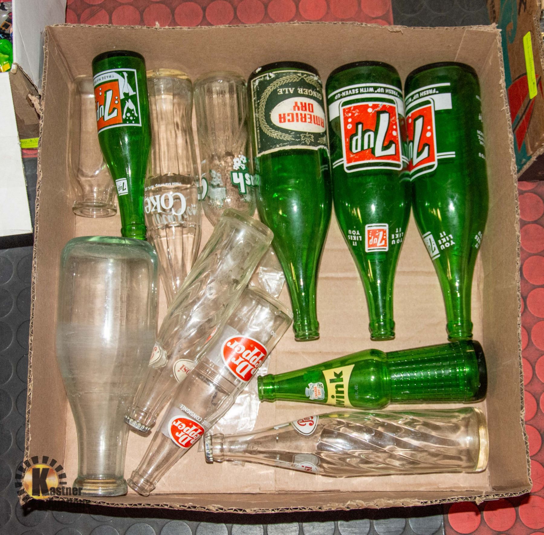 BOX OF VINTAGE COCA-COLA, PEPSI & 7UP BOTTLES