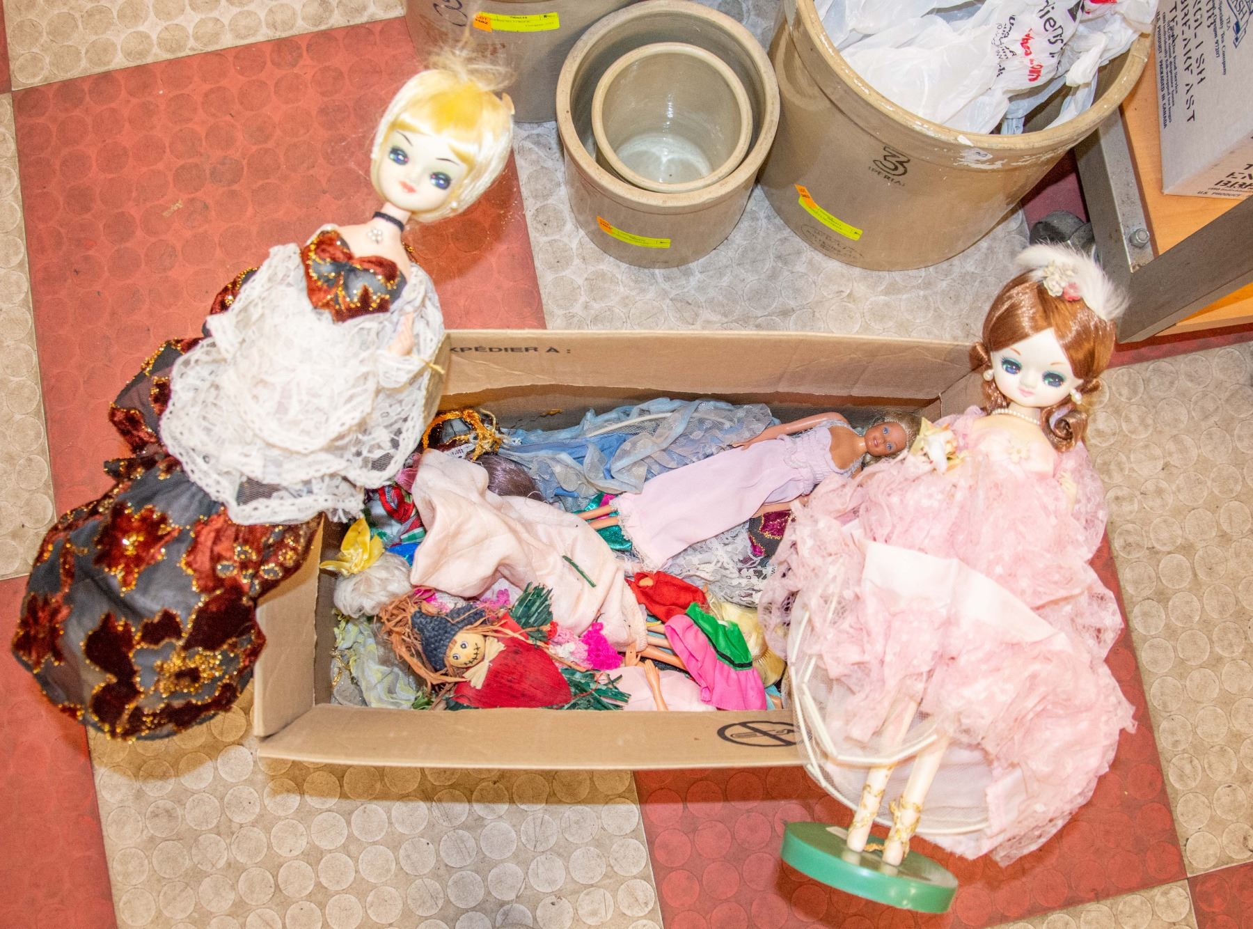 BOX OF VINTAGE DOLLS & ACCESSORIES