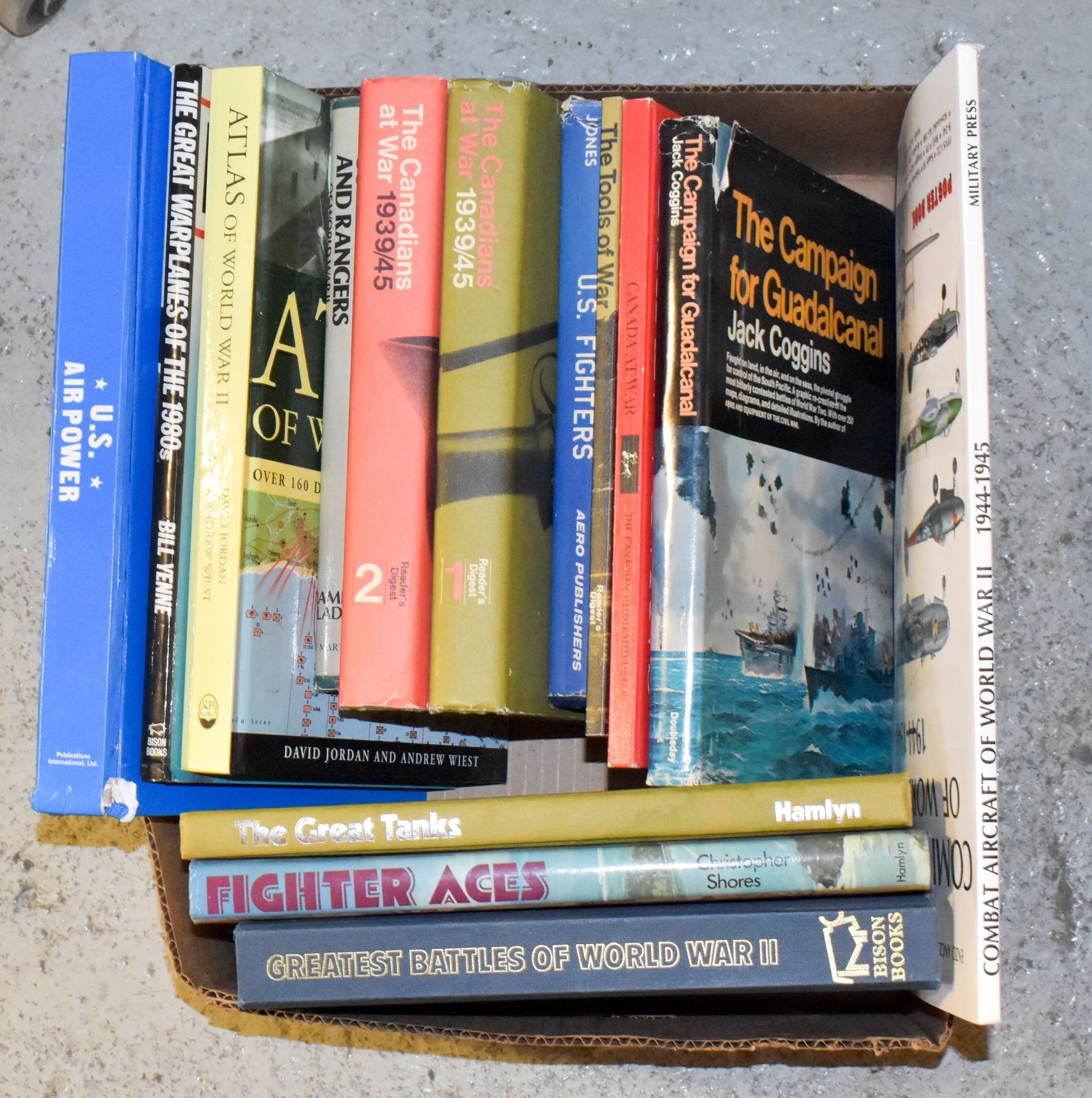 BOOKS INCL. U.S. AIR POWER, COMBAT AIRCRAFT OF WW II, ATLAS OF WW II, THE GREAT TANKS, GREATEST BATTLES OF WW II - 14 LARGE BOOKS