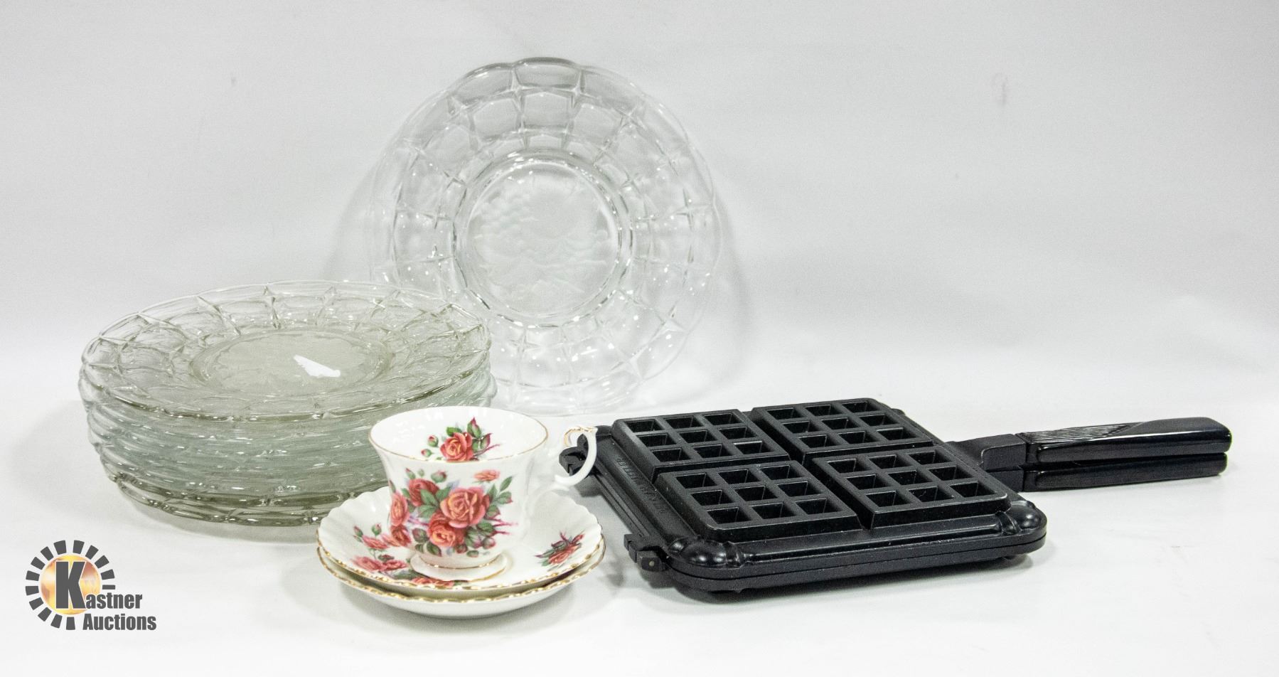 BOX OF VINTAGE GLASS PLATES, WAFFLE IRON ETC.
