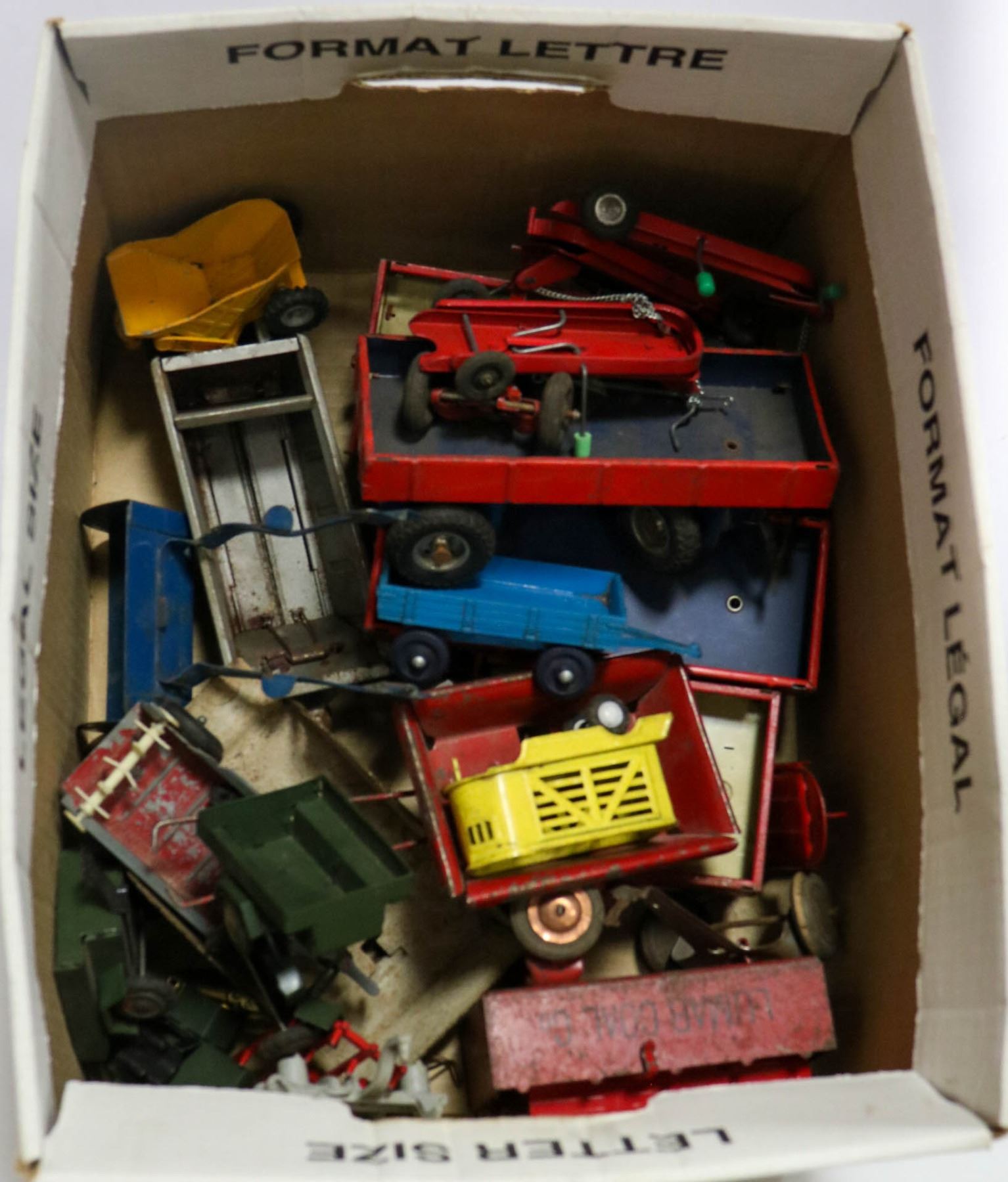 BOX OF VINTAGE TOY TRUCK TRAILERS & MORE