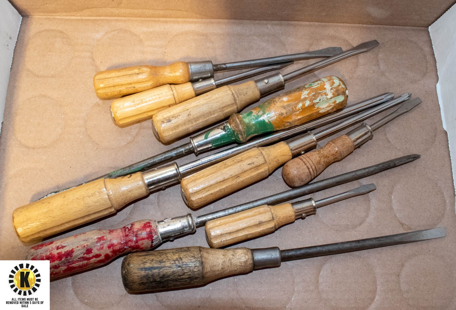 BOX OF VINTAGE WOOD HANDLED SCREWDRIVERS