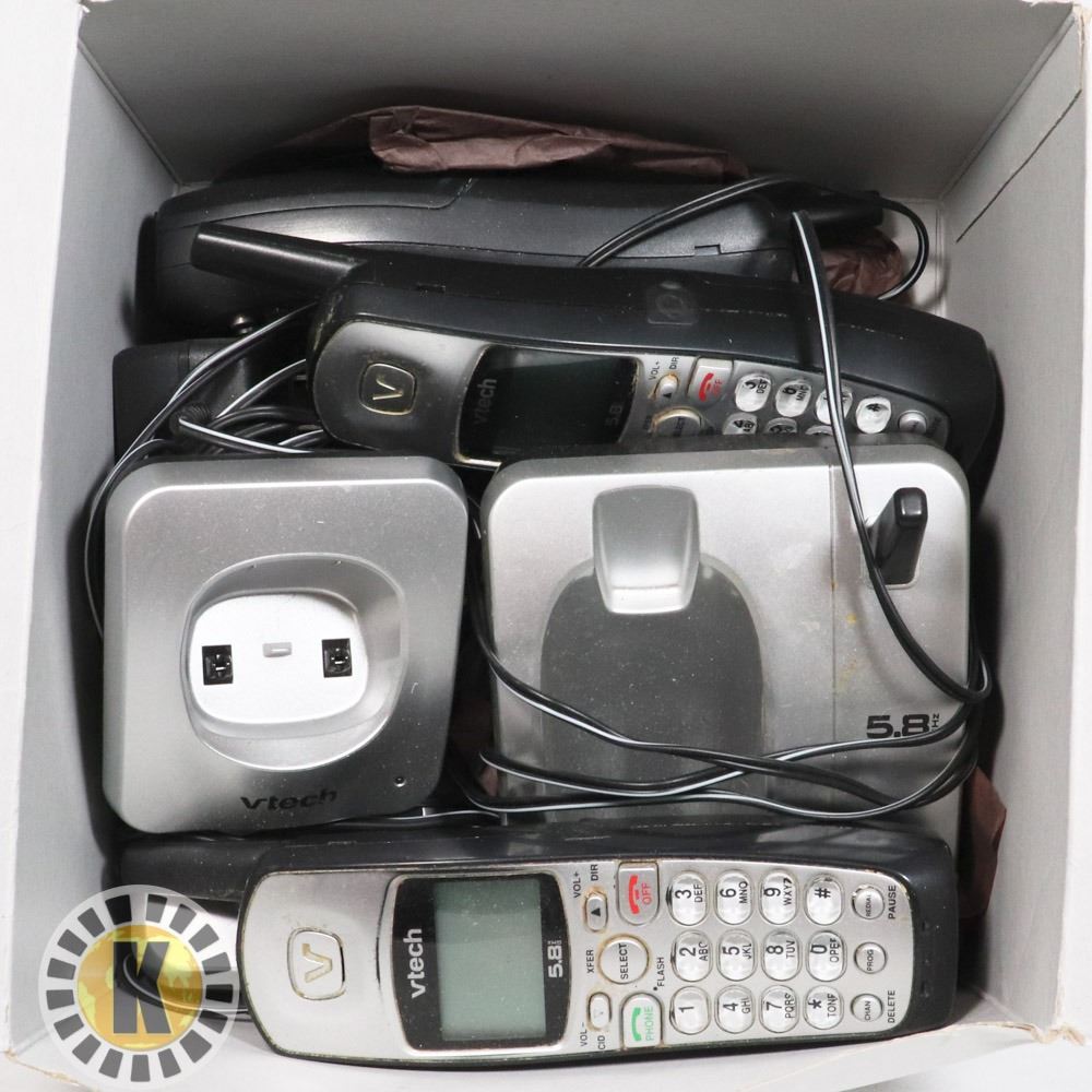 BOX OF VTECH PHONES AND CHARGERS