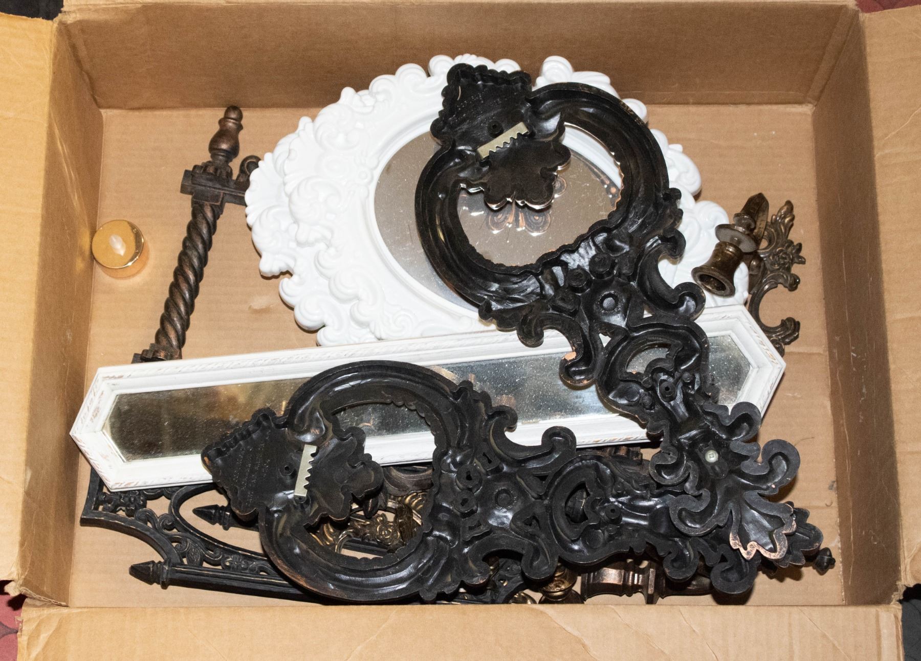 BOX OF WALL SCONCES & DECORATIVE MIRRORS