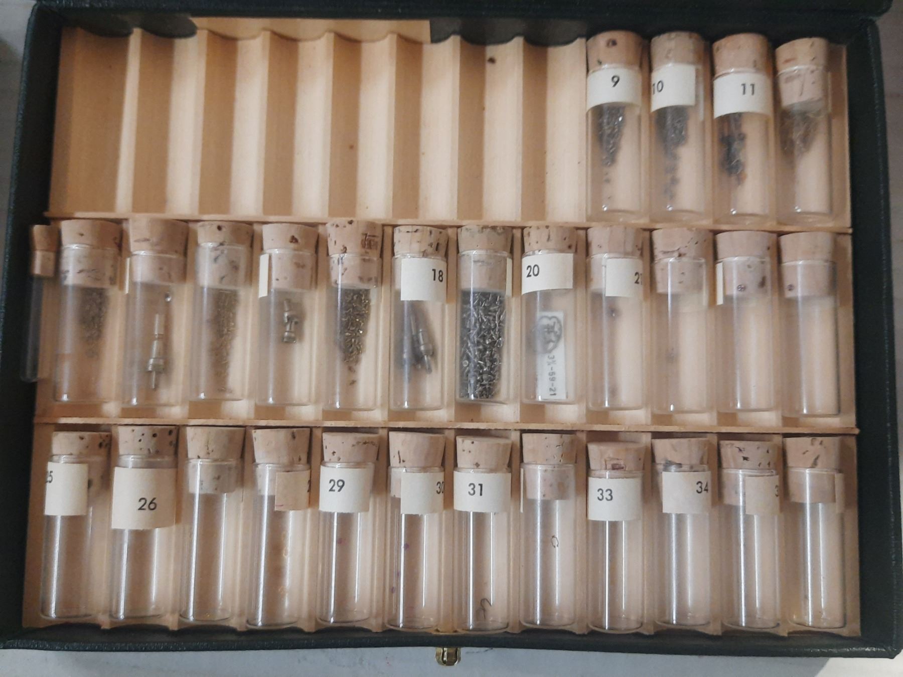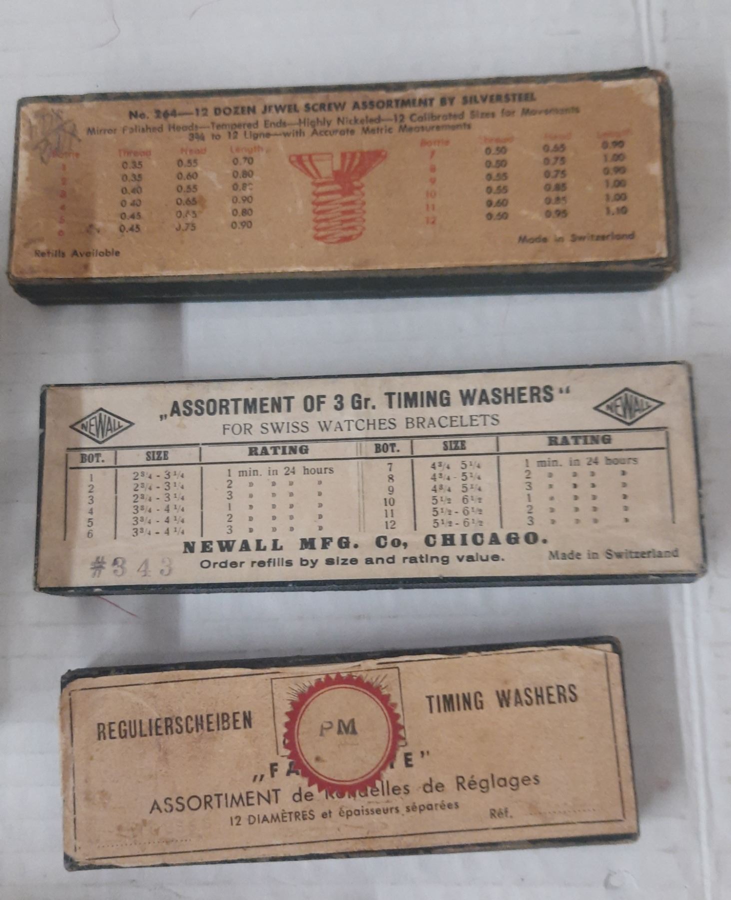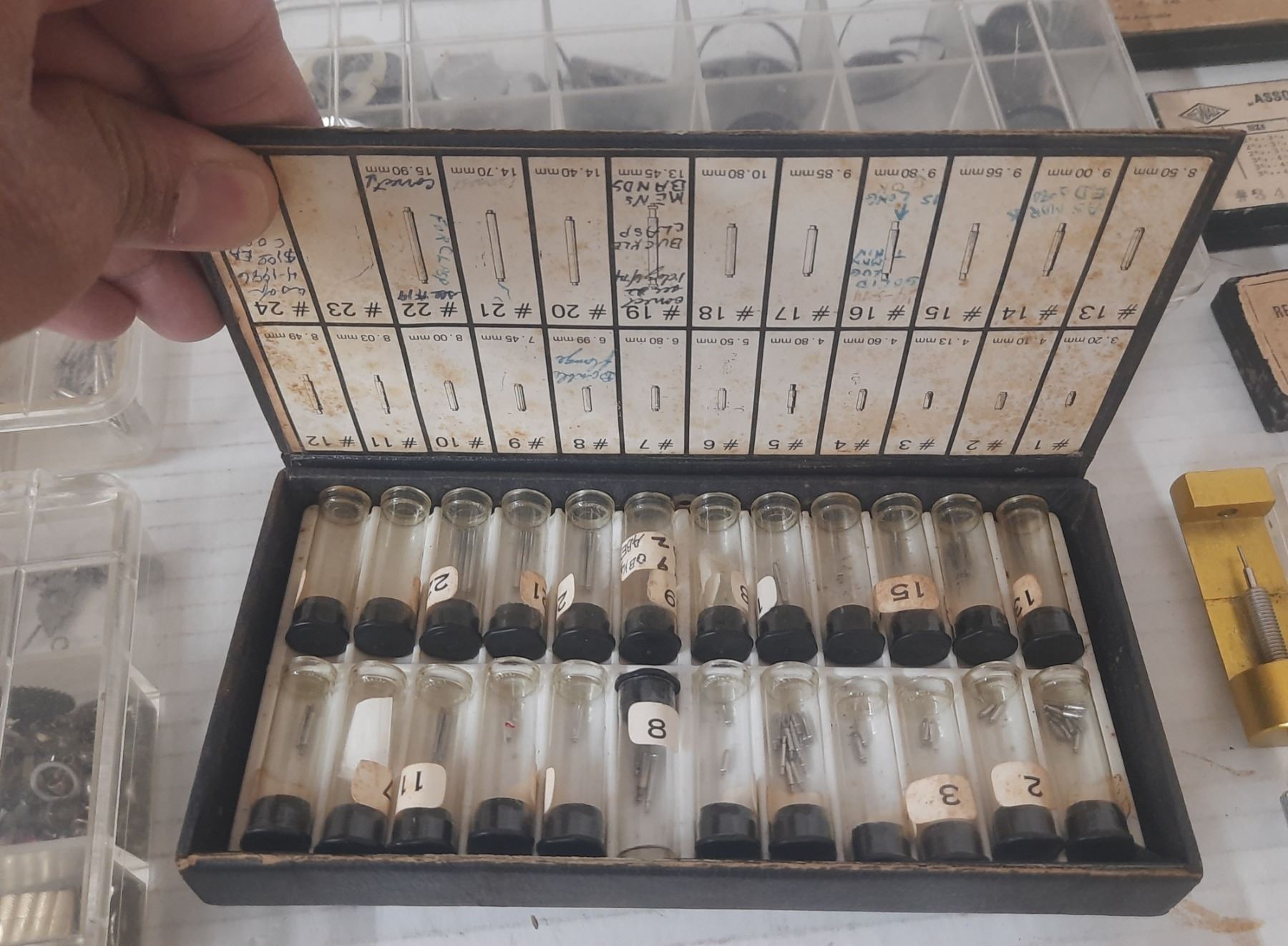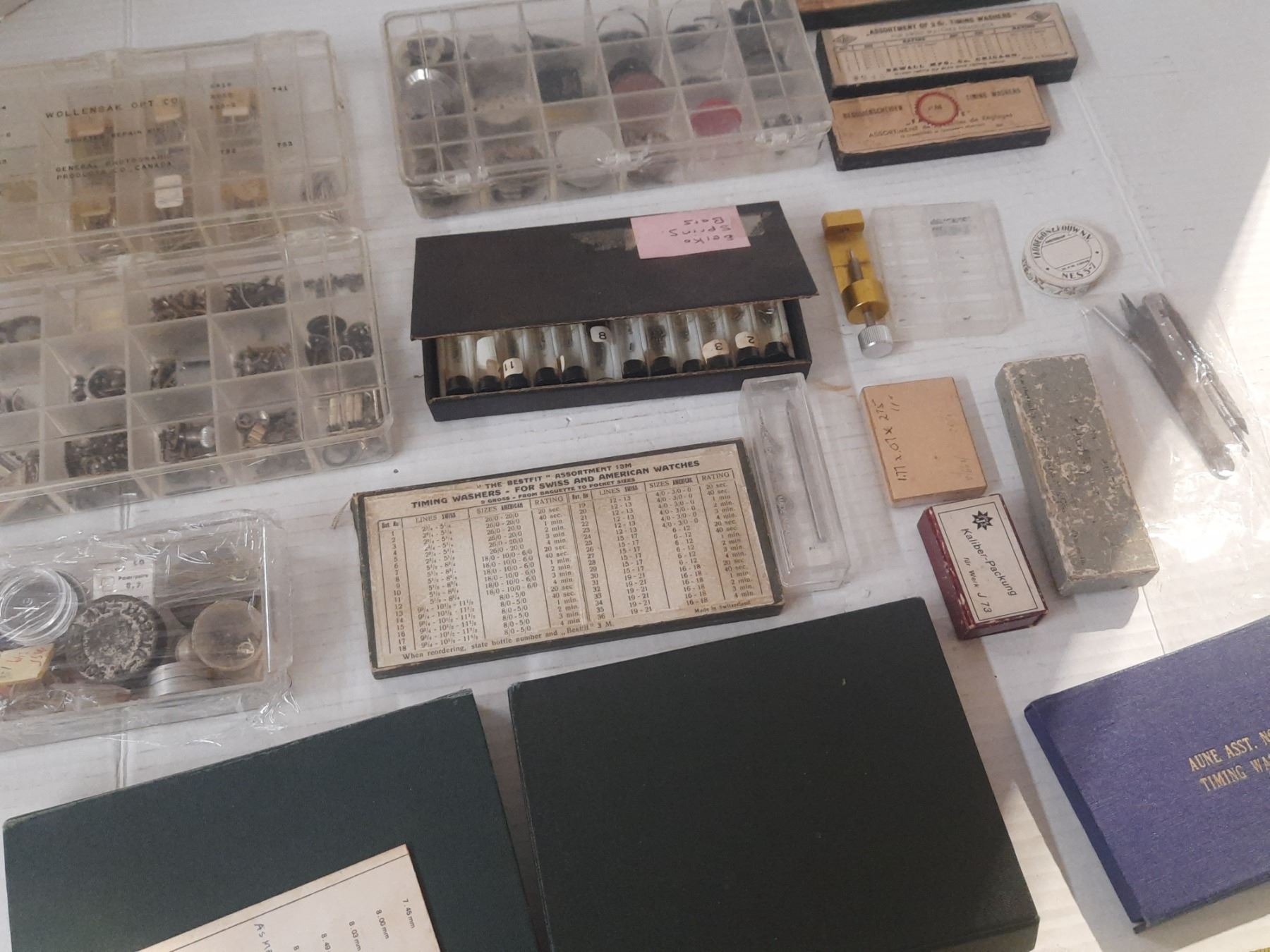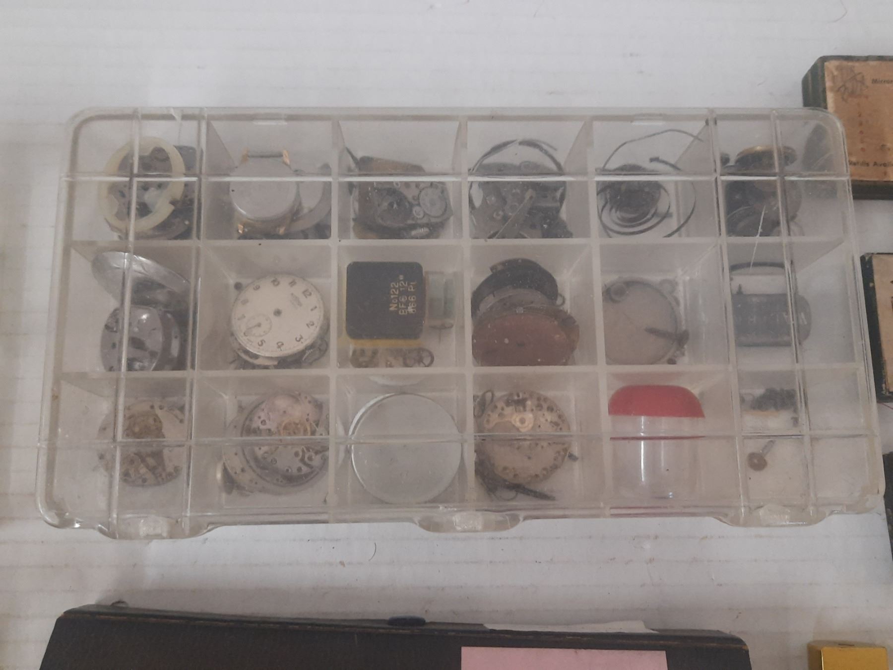 BOX OF WATCH PARTS, SOME USED, SOME NOS, SOME TOOLS