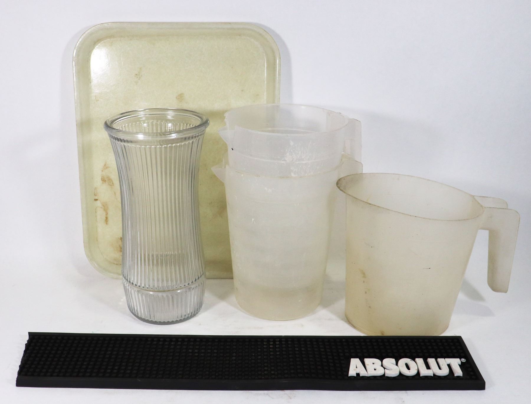 BOX OF WATER PITCHERS, SERVING TRAY, AND