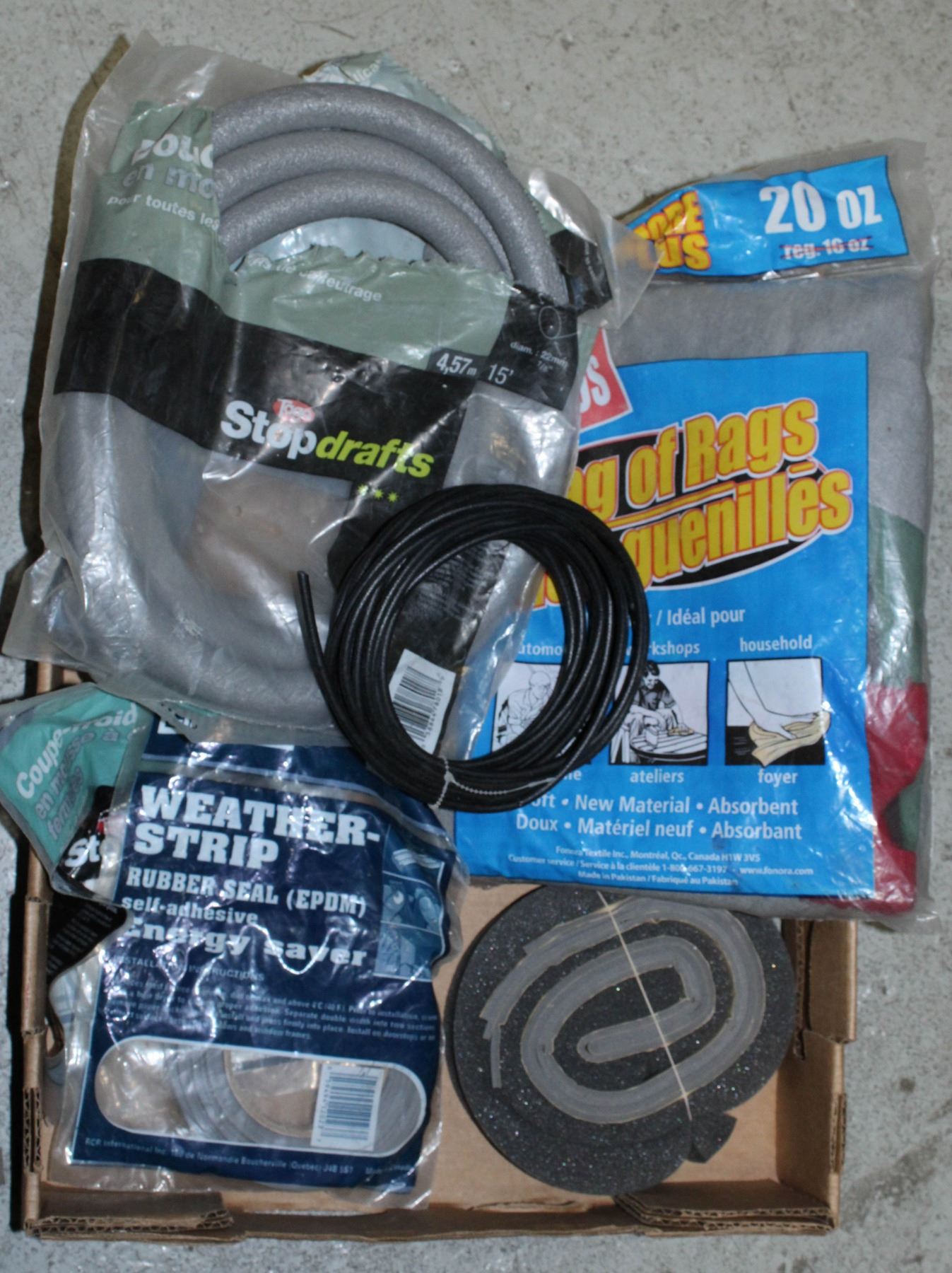 BOX OF WEATHER STRIPS/ BAG OF RAGS
