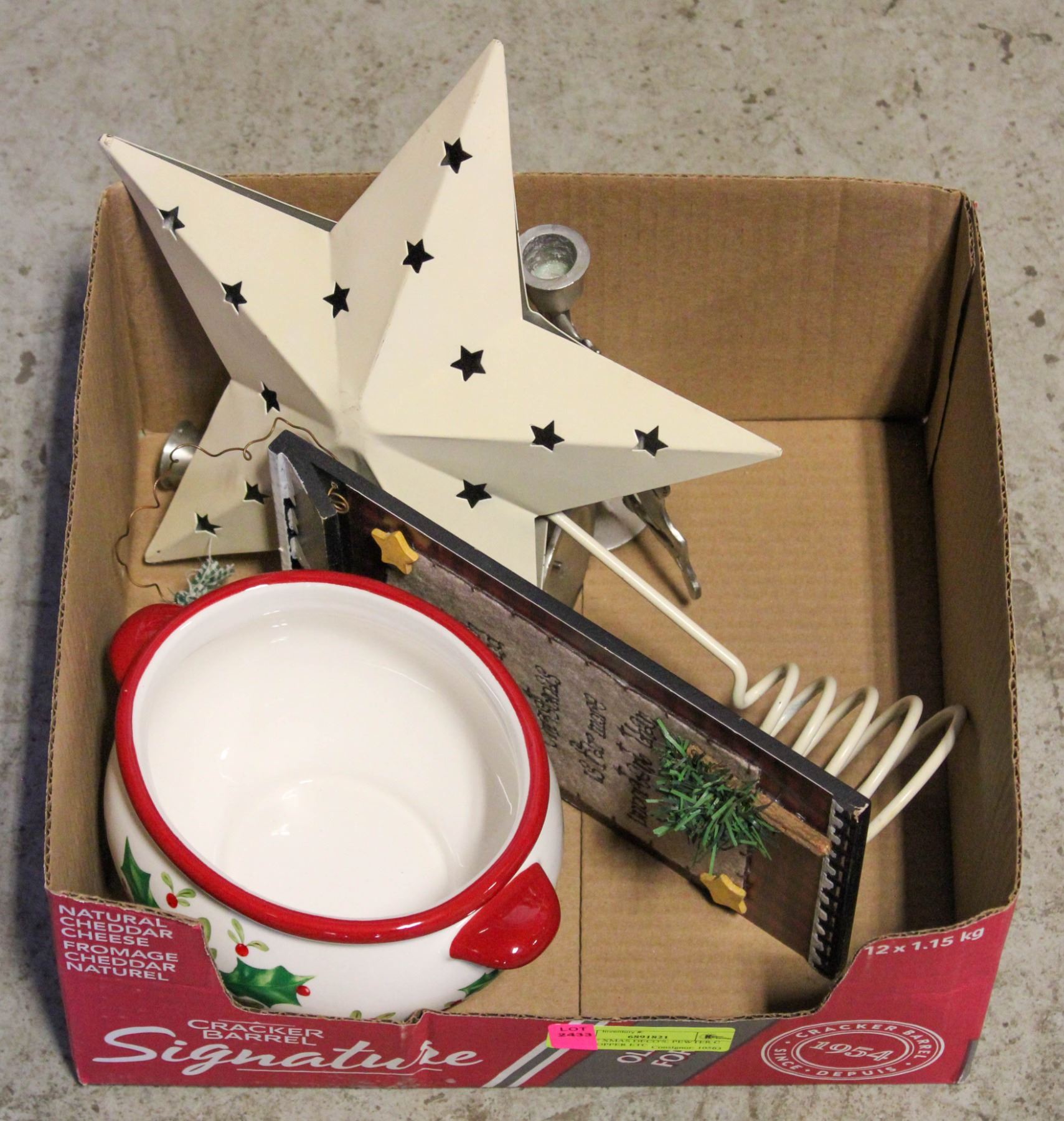 RUSTIC METAL TREE TOPPER, 2 PEWTER CANDLESTICKS, HOLLY BOWL, RUSTIC WALL HANGING W SAYING