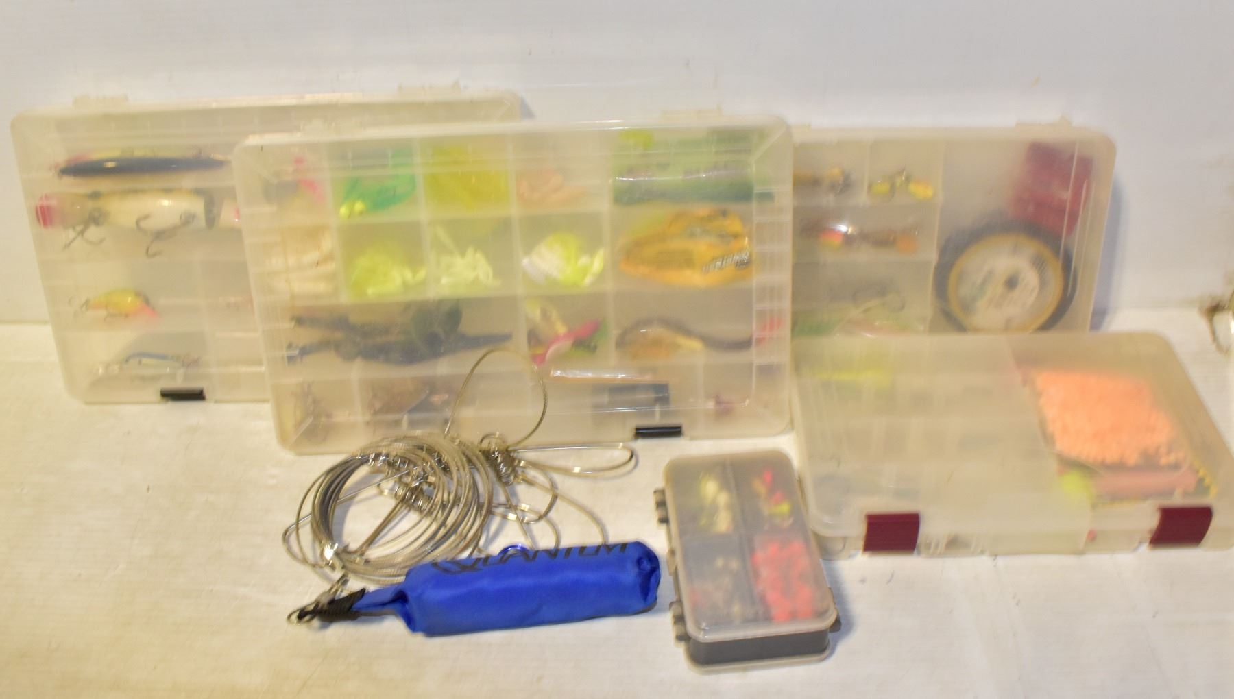 BOX W/ 4 PLANO CASES OF FISHING LURES AND MORE.