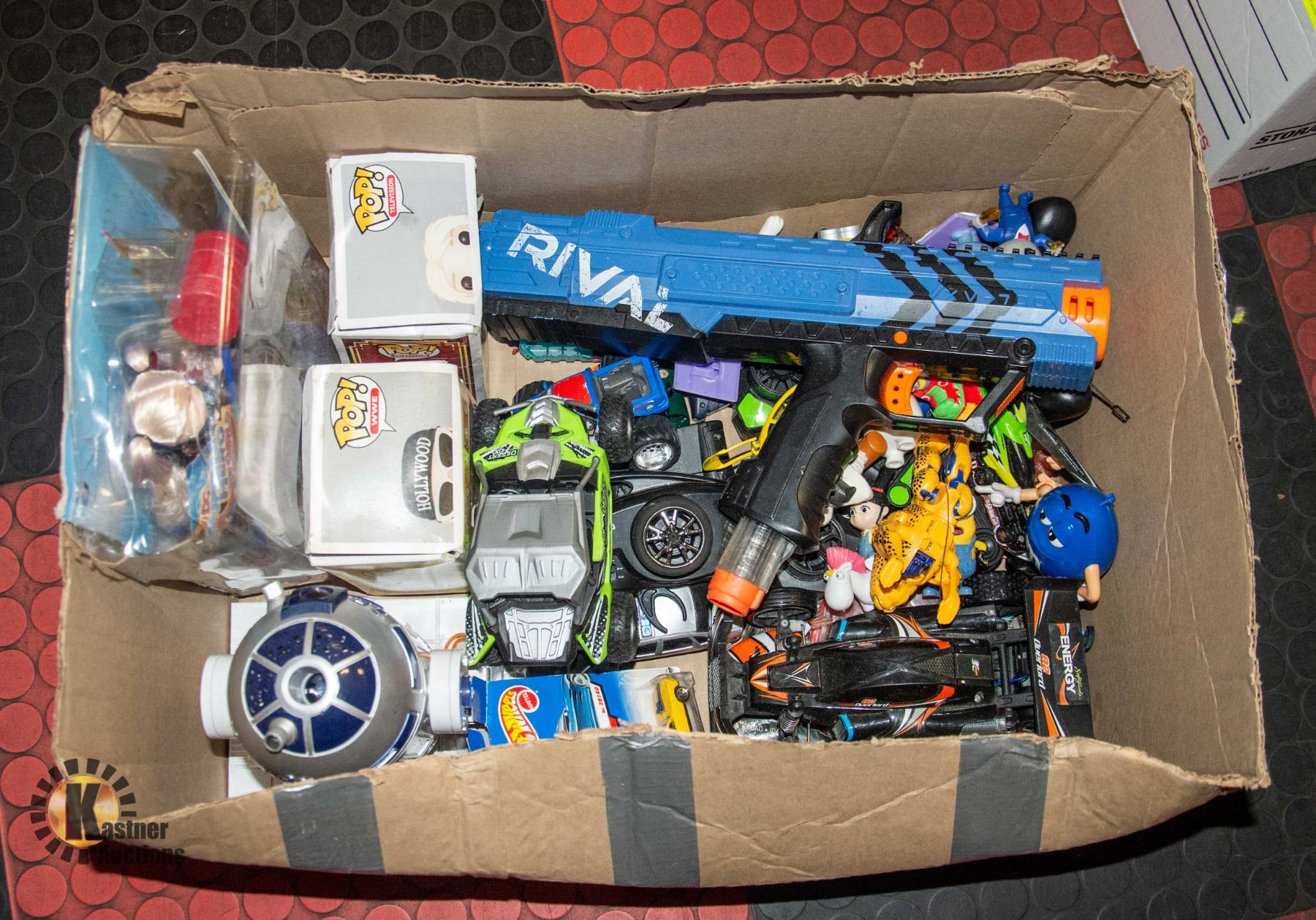 BOX W/ VARIOUS TOYS AND NERF GUN