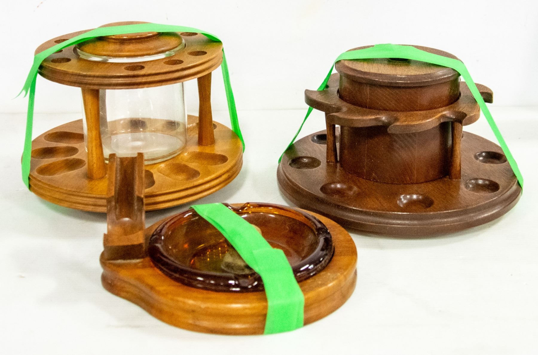 BOX WITH 2 ANTIQUE PIPE CADDIES, AND ASHTRAY WITH