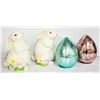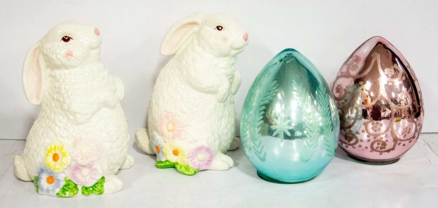 LARGE DECORATIVE GLASS EGGS (RABBITS: 9.5"L X 6"W X 8"H AND EGGS: 8"-TALL X 6"-DIAM)