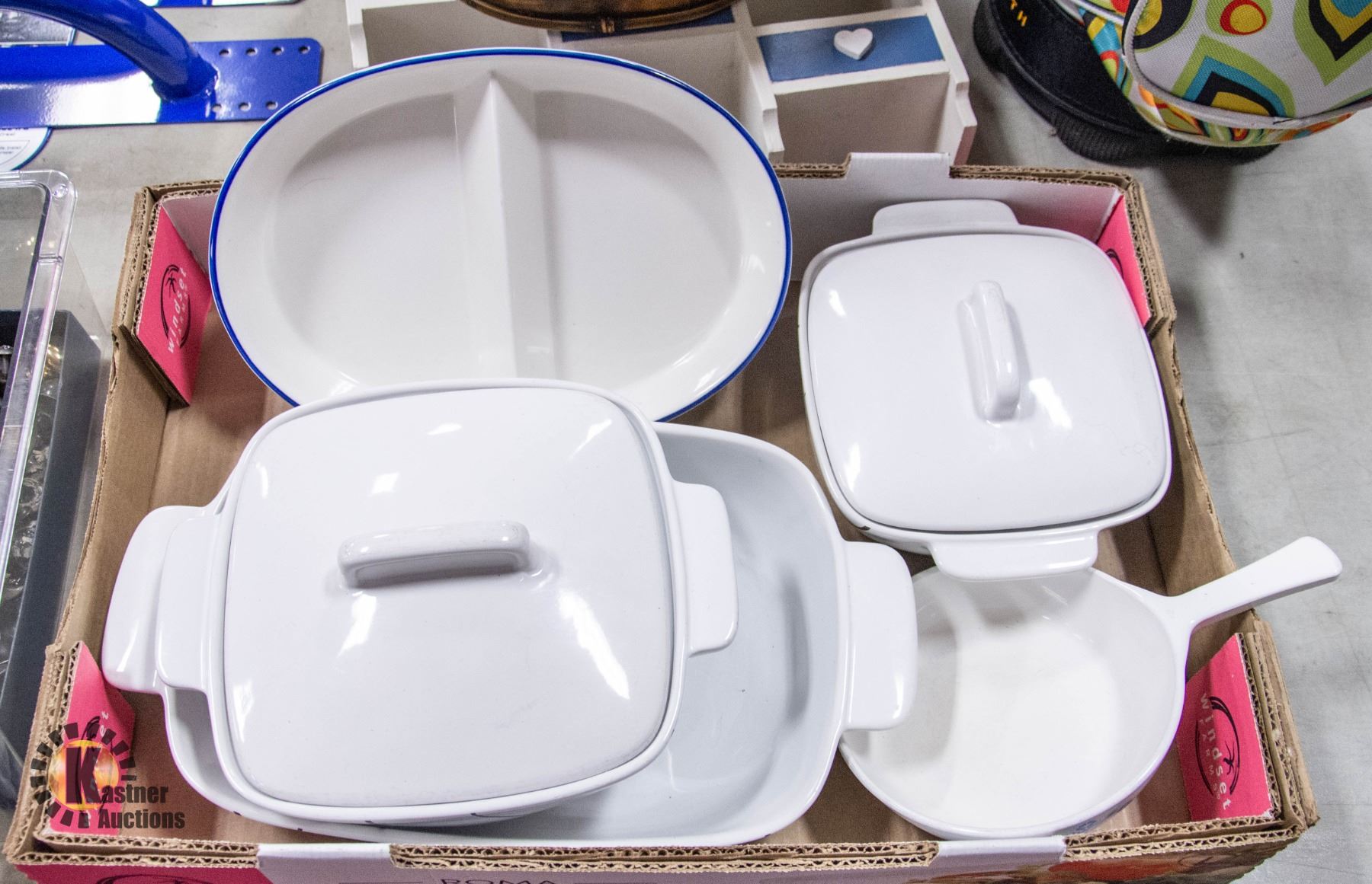 BAKEWARE DISHES WITH LIDS, RECTANGLE BAKEWARE, PAN AND 2-SECTION DISH BOWL **ALL ITEMS MUST BE REMOVED BY 5PM SATURDAY, JULY 8ST 2023. ALL REMAINING ITEMS WILL BE SUBJECT TO A $6.00 PER DAY STORAGE CHARGE. ANY ITEMS REMAINING AFTER MONDAY, JULY 24TH, 2023 WILL BE CONSIDERED FORFEITED. NO REFUNDS WILL BE ISSUED FOR FORFEITED ITEMS. TO SCHEDULE A PICK UP APPOINTMENT CLICK HERE