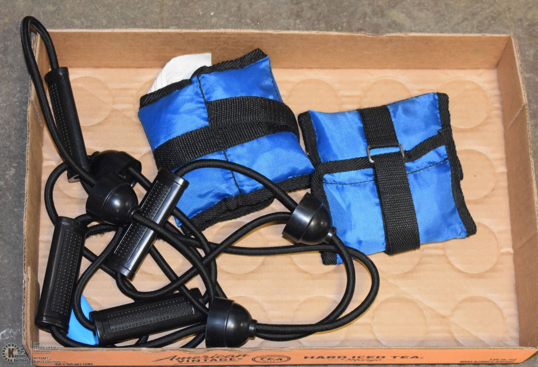 BOX WITH 2 X 2LB WEIGHTS AND RESISTANCE BANDS.