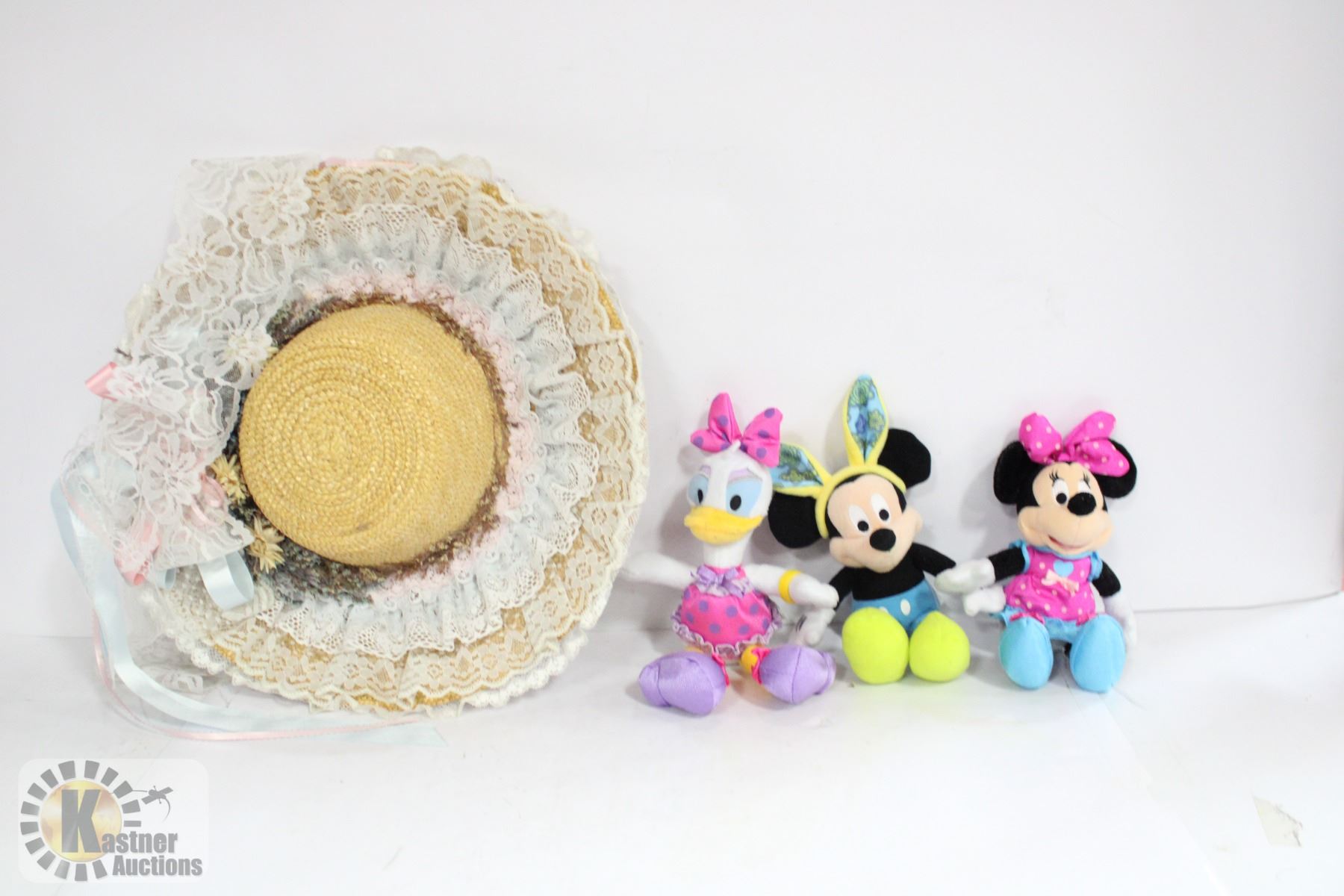 AND "AVONLEA" STRAW HAT WITH LACE AND RIBBONS - MICKEY WITH RABBIT EARS, MINNIE MOUSE AND DAISY DUCK
