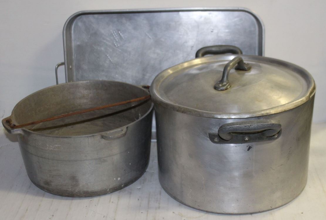 DUTY LARGE COOK POTS AND BAKE/CASSEROLE TRAY - LARGE POT WITH LID 17"-DIAM. X 10"-TALL WITH LID, HANGING HEAVY STEW POT (12"-DIAM. X 6.5"H) AND CASSEROLE TRAY (8.5"W X 13"L)