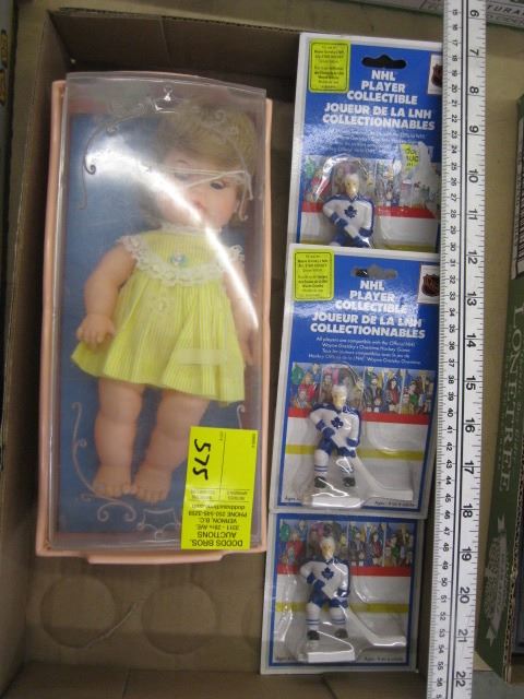 BOX WITH 3 HOCKEY FIGURINES, DOLL