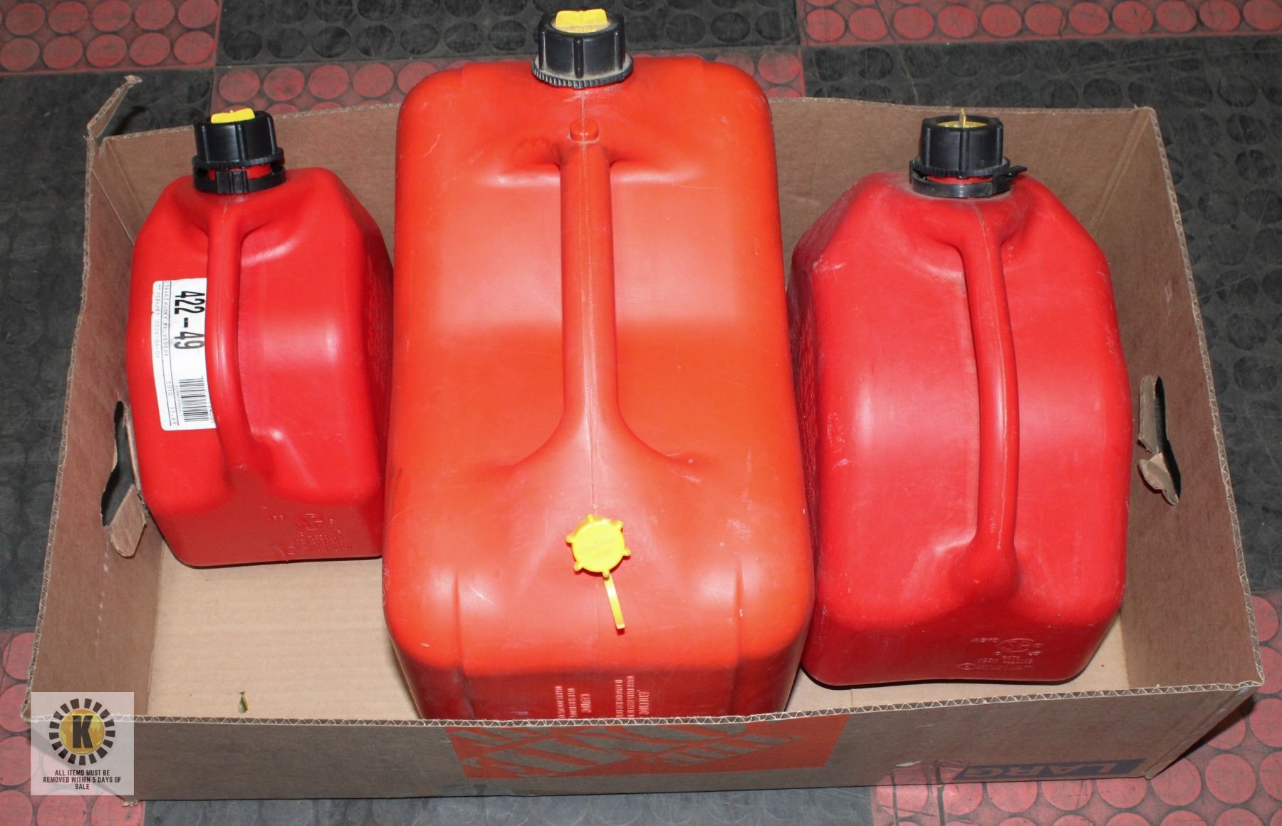 RATED CONTAINERS WITH SPOUTS - ONE - 23 LITER, ONE - 10 LITER AND ONE 5 LITER CONTAINERS **ALL ITEMS MUST BE REMOVED BY 5PM SATURDAY, APRIL 3RD 2025. ALL REMAINING ITEMS WILL BE SUBJECT TO A $6.00 PER DAY STORAGE CHARGE. ANY ITEMS REMAINING AFTER MONDAY, MAY 19TH 2025 WILL BE CONSIDERED FORFEITED. NO REFUNDS WILL BE ISSUED FOR FORFEITED ITEMS. TO SCHEDULE A PICK UP APPOINTMENT CLICK HERE