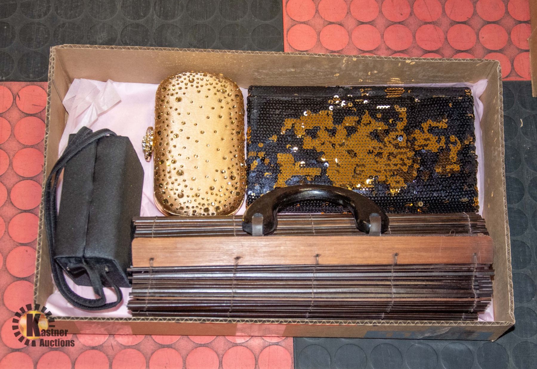 HARDBODY WITH RHINESTONES, LISE WATIER BLACK & GOLD PURSE, A SMALL BLACK EVENING PURSE AND 1 BROWN WOODEN DESIGN PURSE **ALL ITEMS MUST BE REMOVED BY 5PM SATURDAY, FEBRUARY 24TH 2024. ALL REMAINING ITEMS WILL BE SUBJECT TO A $6.00 PER DAY STORAGE CHARGE. ANY ITEMS REMAINING AFTER MONDAY, MARCH 11TH, 2023 WILL BE CONSIDERED FORFEITED. NO REFUNDS WILL BE ISSUED FOR FORFEITED ITEMS. TO SCHEDULE A PICK UP APPOINTMENT CLICK HERE