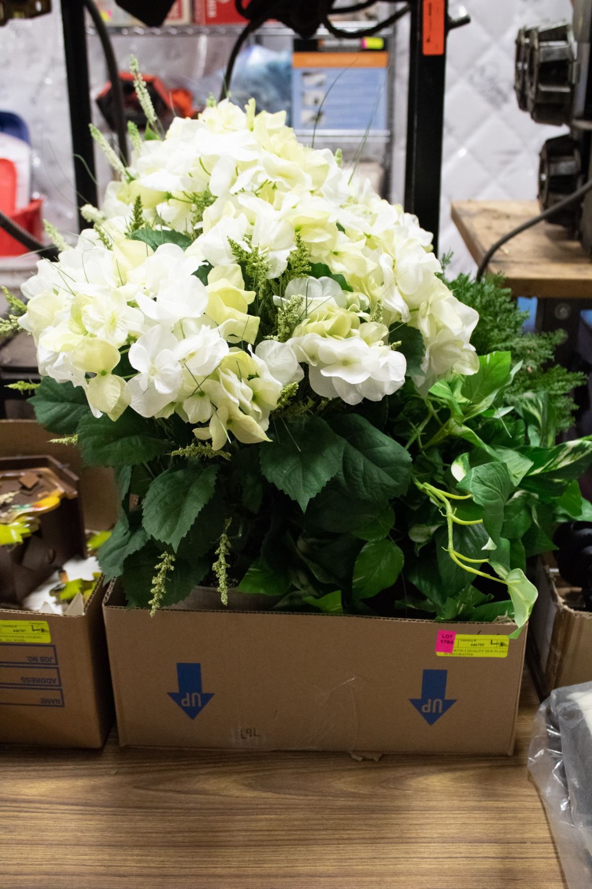 CONTAINERS - 2 TALL WHITE/CREAM SILK FLOWERS, MINI GREEN CEDAR TREE, ETC.